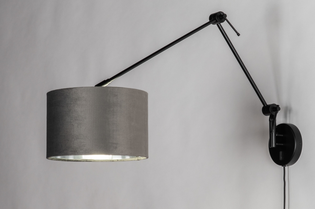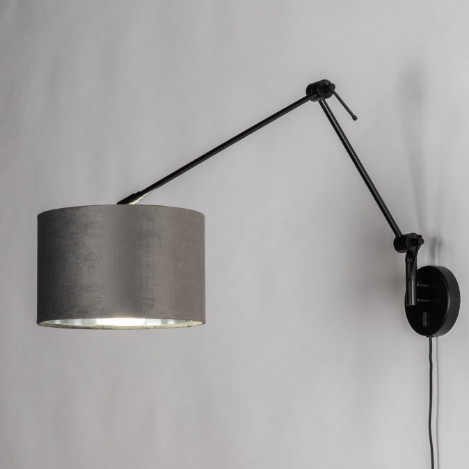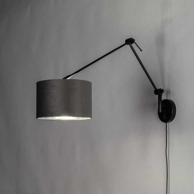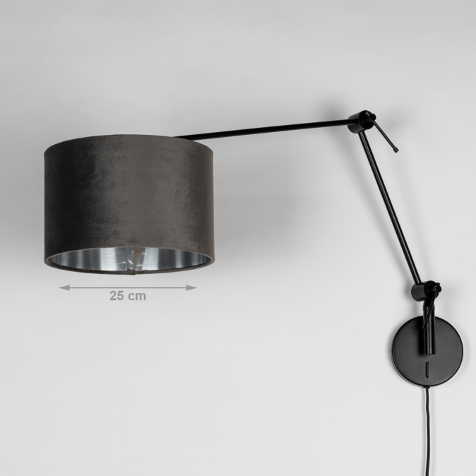 Černé nastavitelné nástěnné svítidlo se sametovým šedým stínidlem