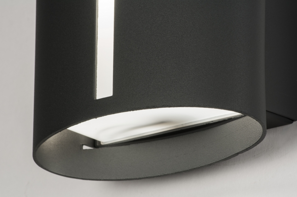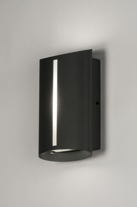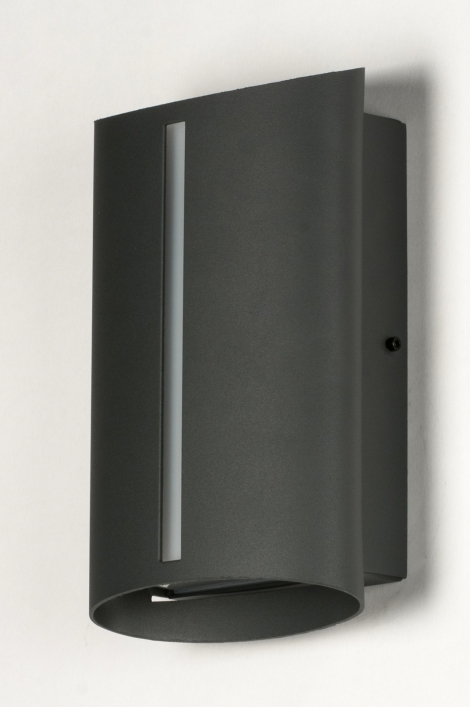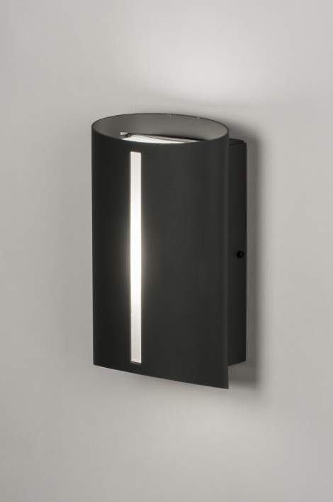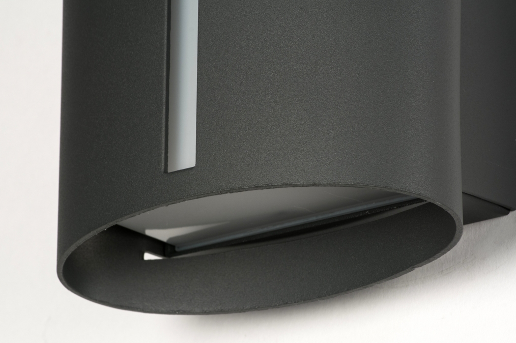 Nástěnné venkovní svítidlo v elegantním, nadčasovém designu vyrobeno z hliníku v antracitové barvě a plastu v barvě bílé. Třída ochrany: IP 44.