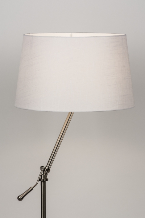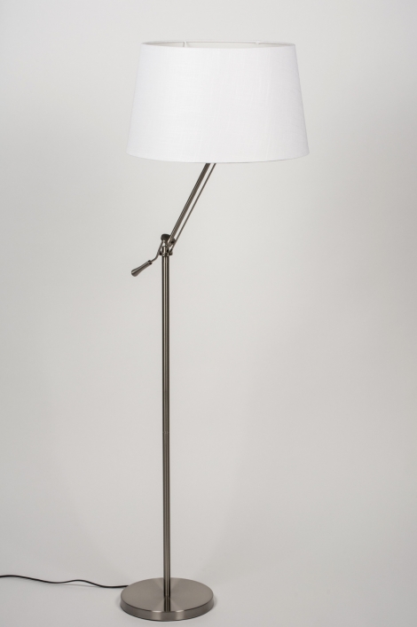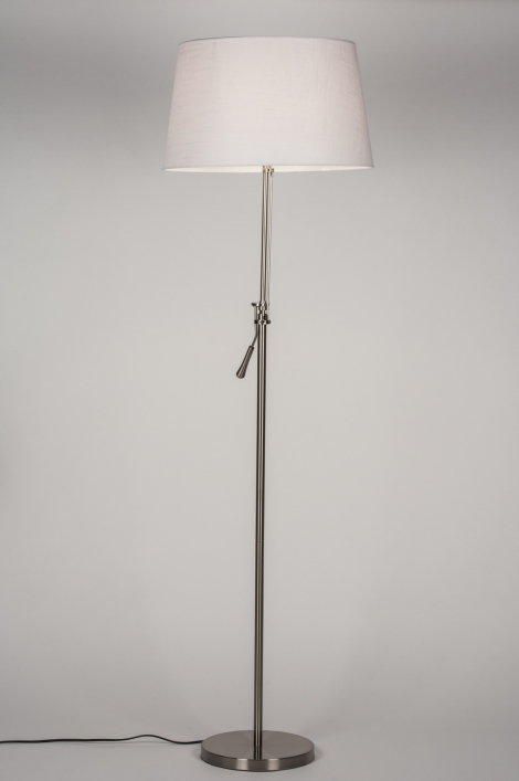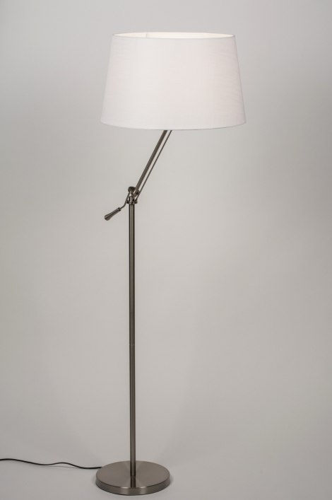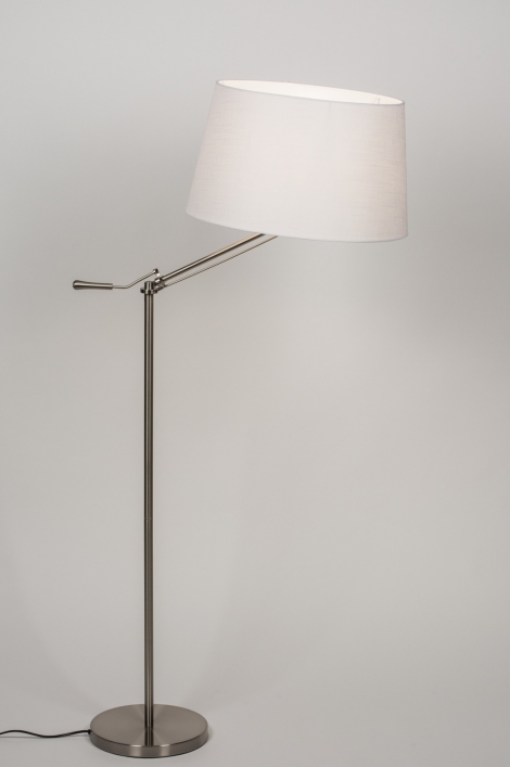 Stojací lampa vyrobená z nerezové oceli a textílie v bílé barvě