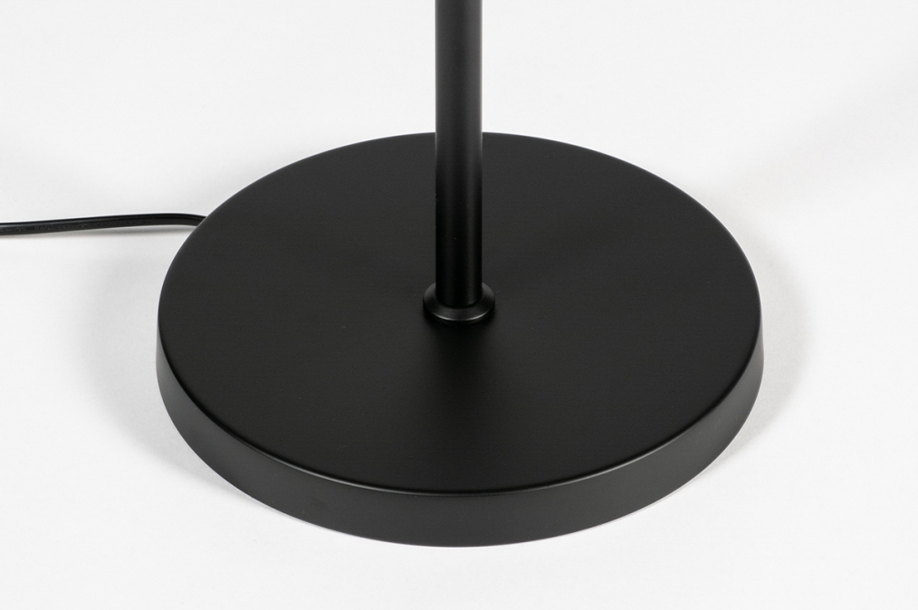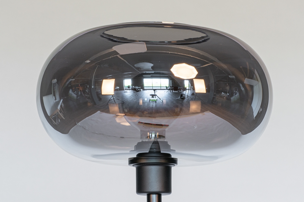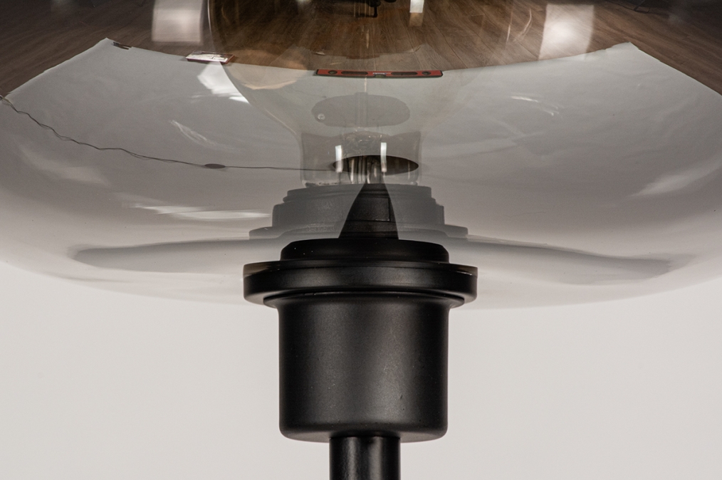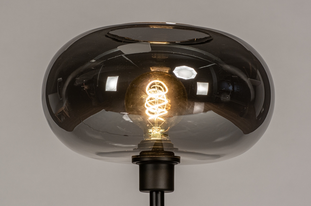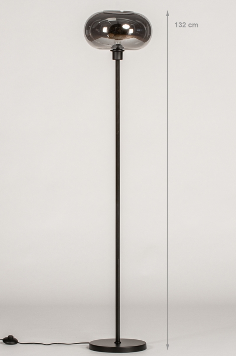 Stojací lampa v moderním designu vyrobená z kovu a kouřového skla.