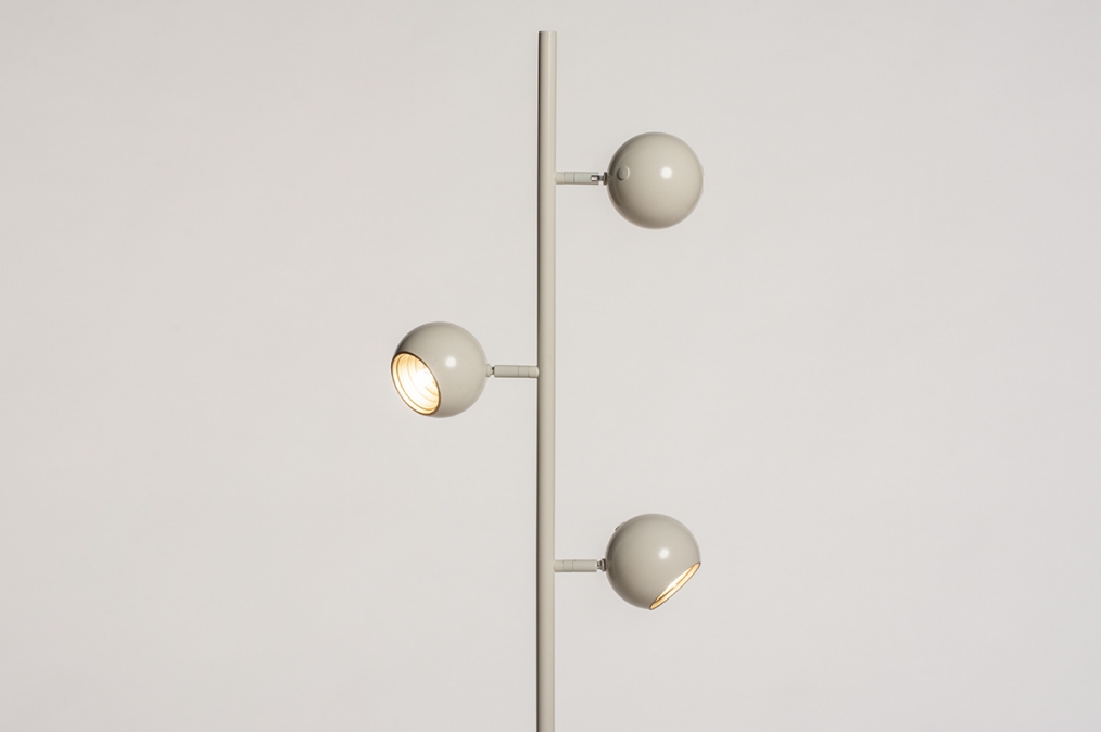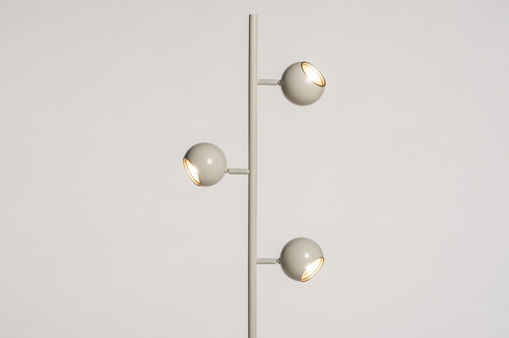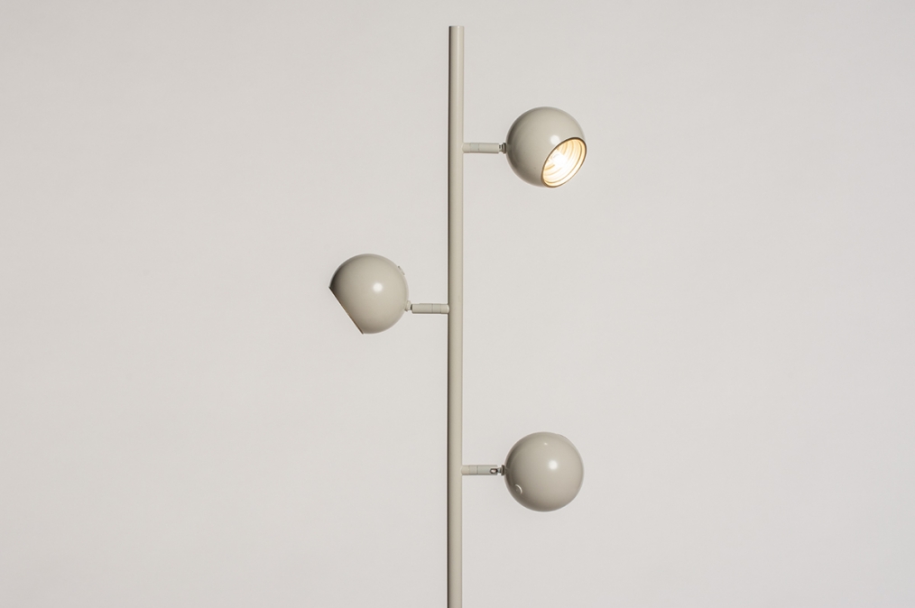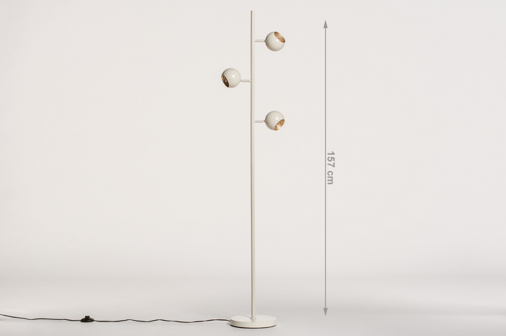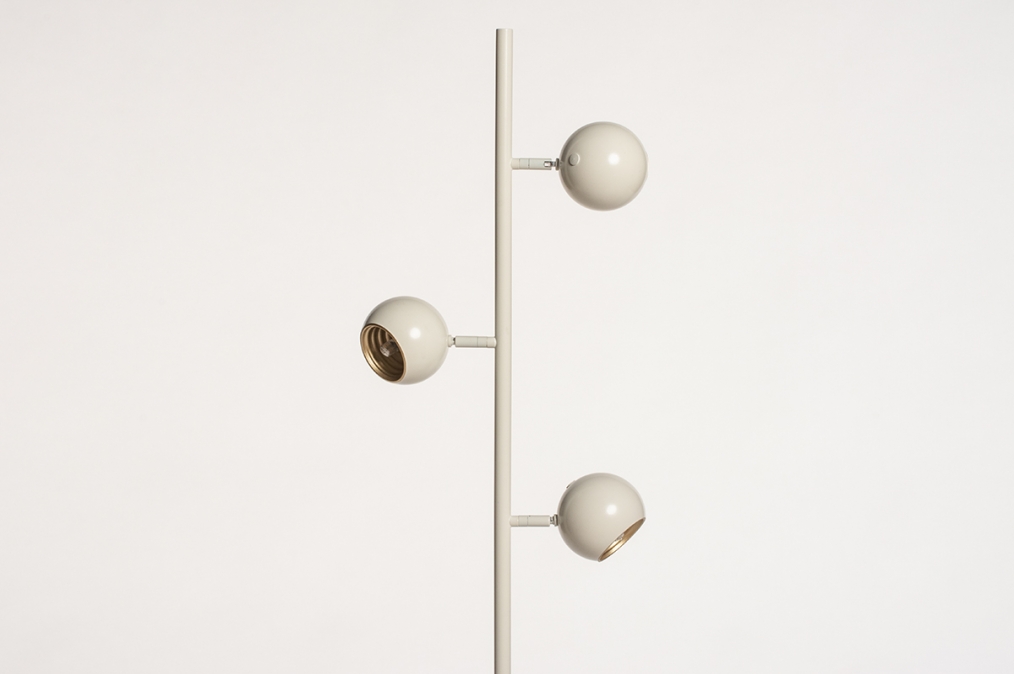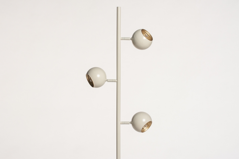 Stojací lampa v moderním designu vyrobená z kovu v kombinaci krémové, bílé a zlaté barvy.