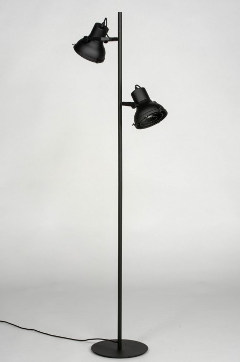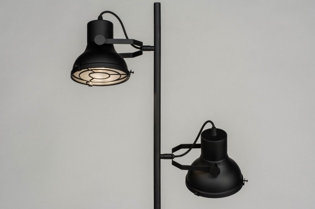 Stojací lampa v robustním industriálním designu vyrobená z kovu v matně černé barvě.