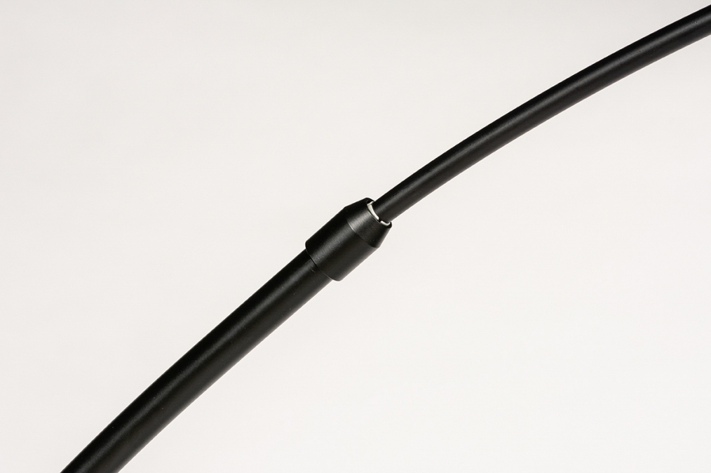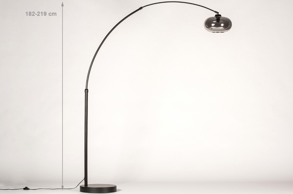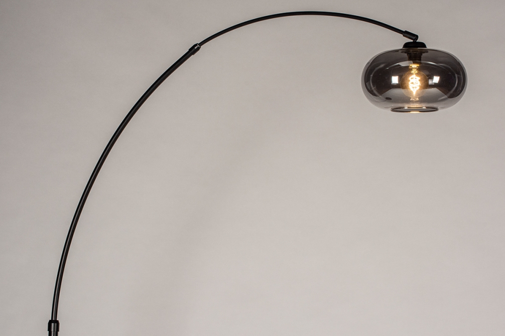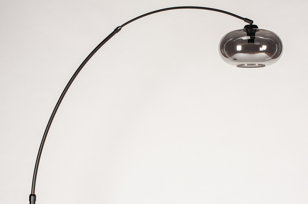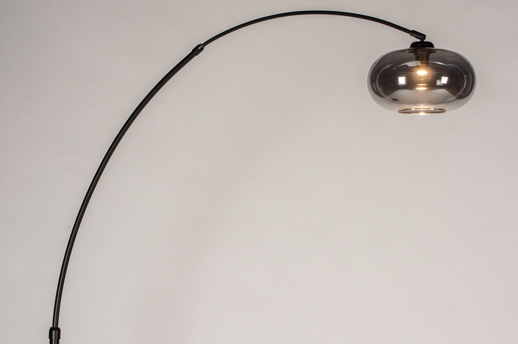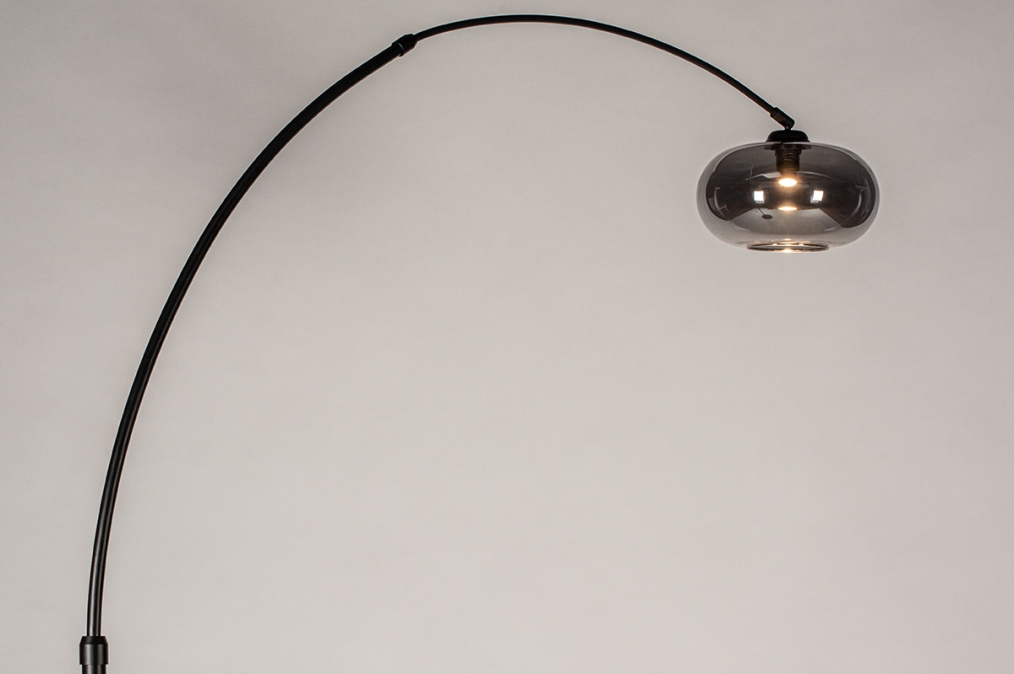 Stojací oblouková lampa v moderním designu vyrobená z kovu a kouřového skla.