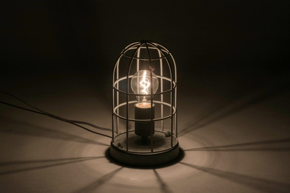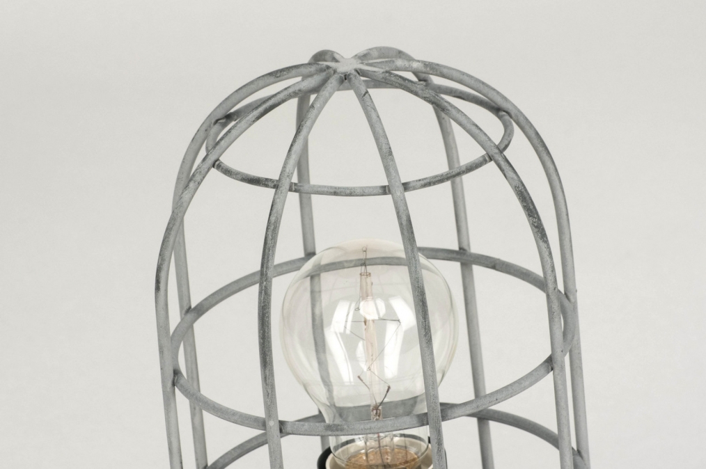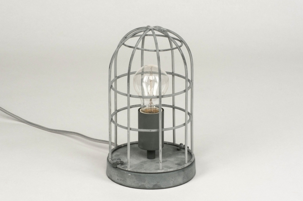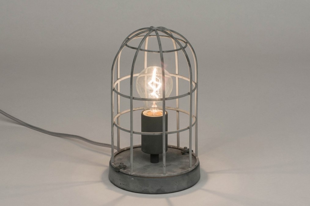 Originální stolní lampa v industriálním designu vyrobená z kovu v betonově šedé barvě.