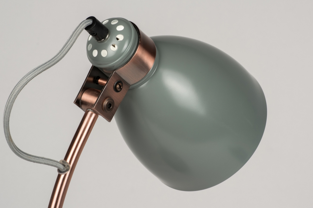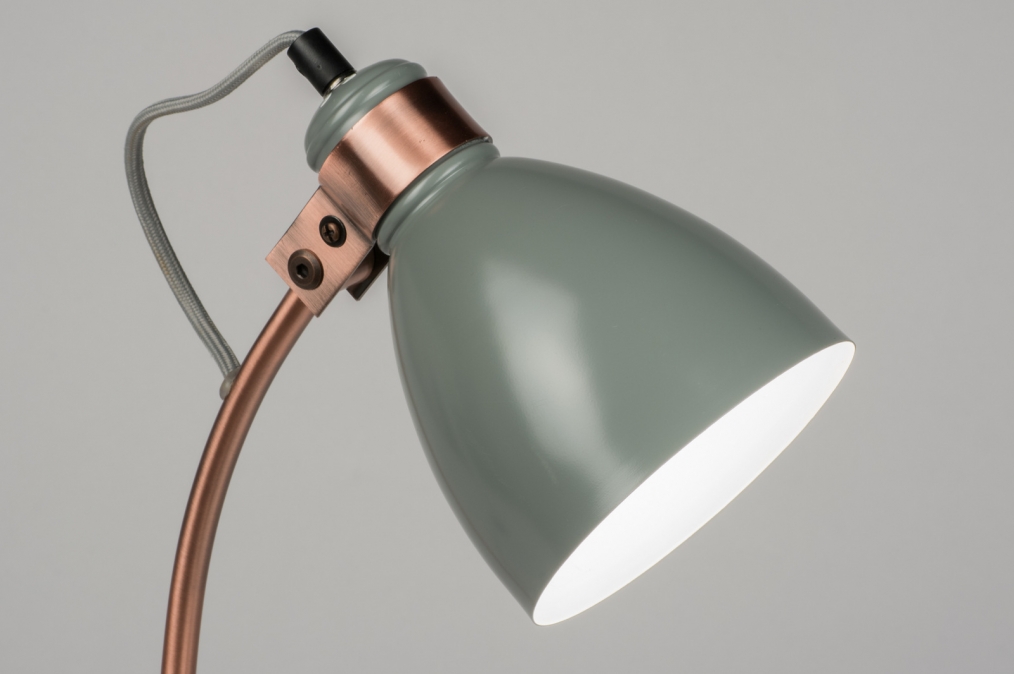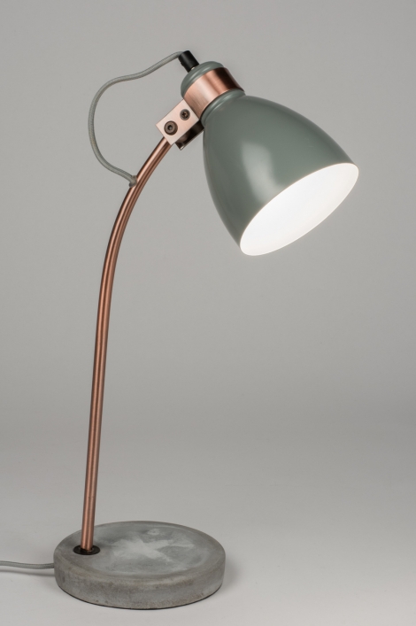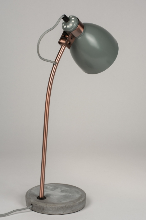 Krásná stolní industriální retro lampa ve vysoce atraktivní modré barvě s kombinací měděné barvy s nohou z hrubého betonu. Záruka 10 let.