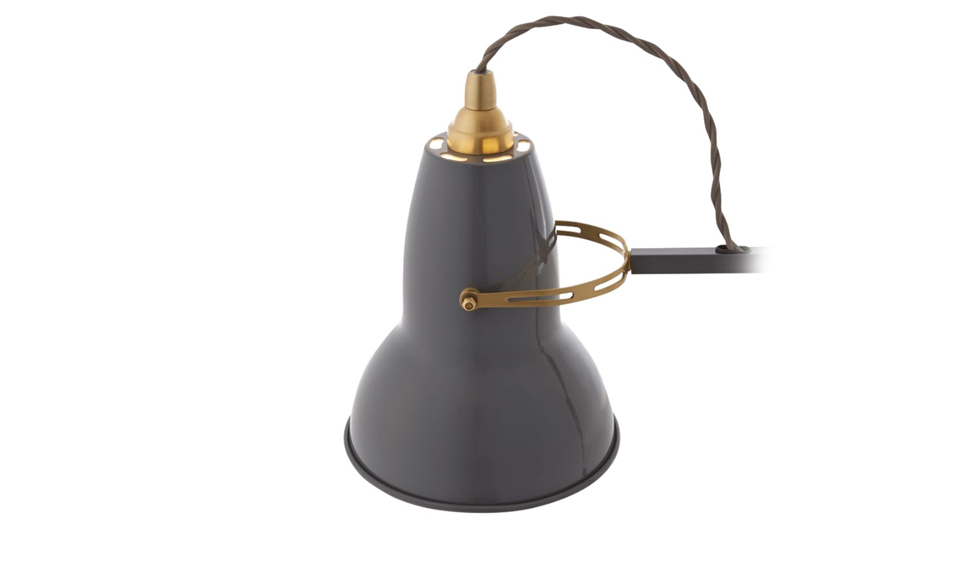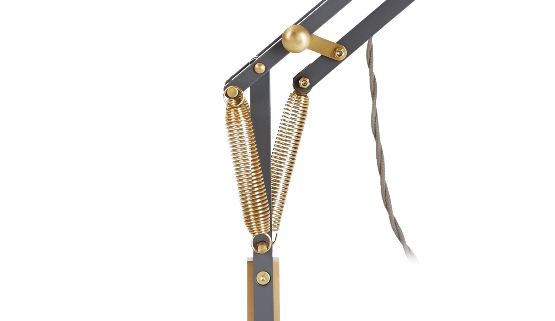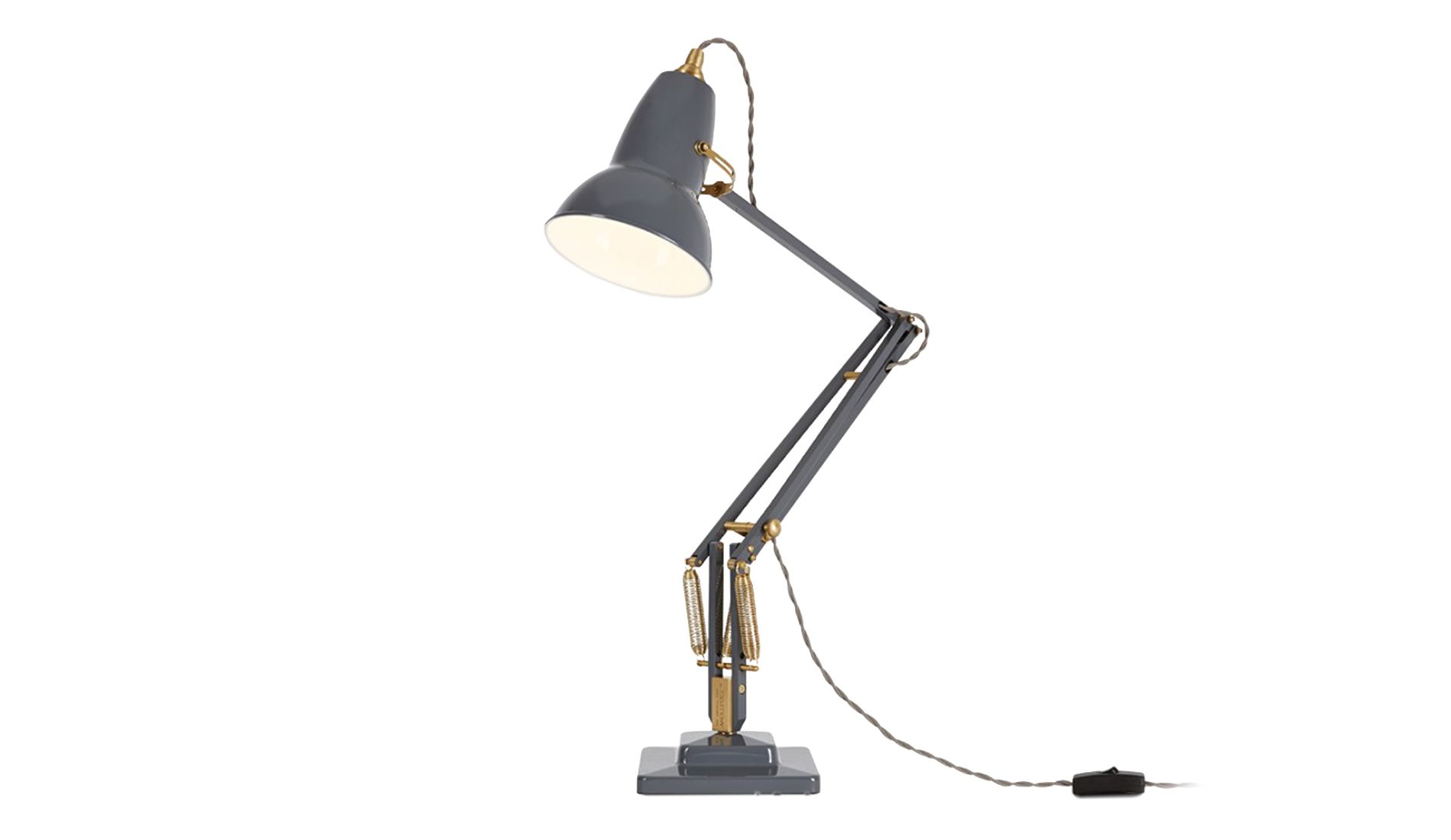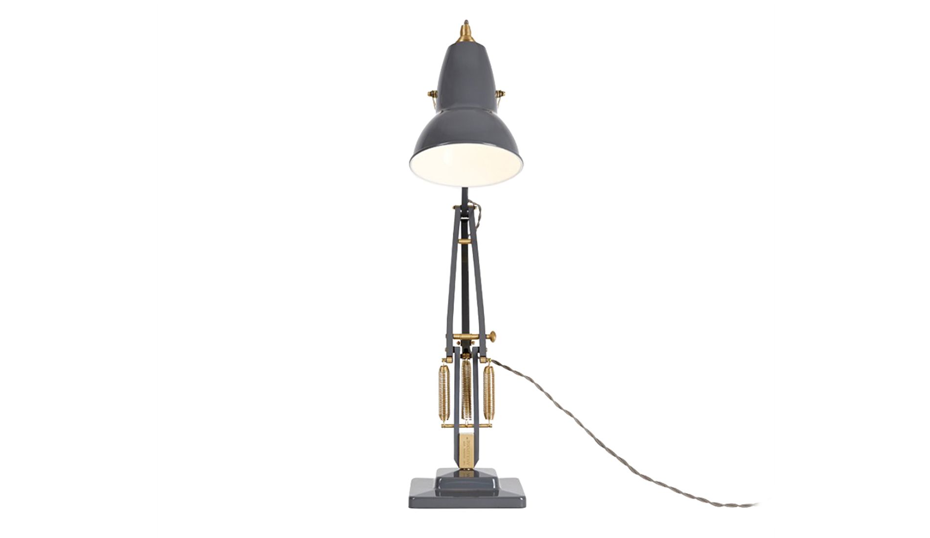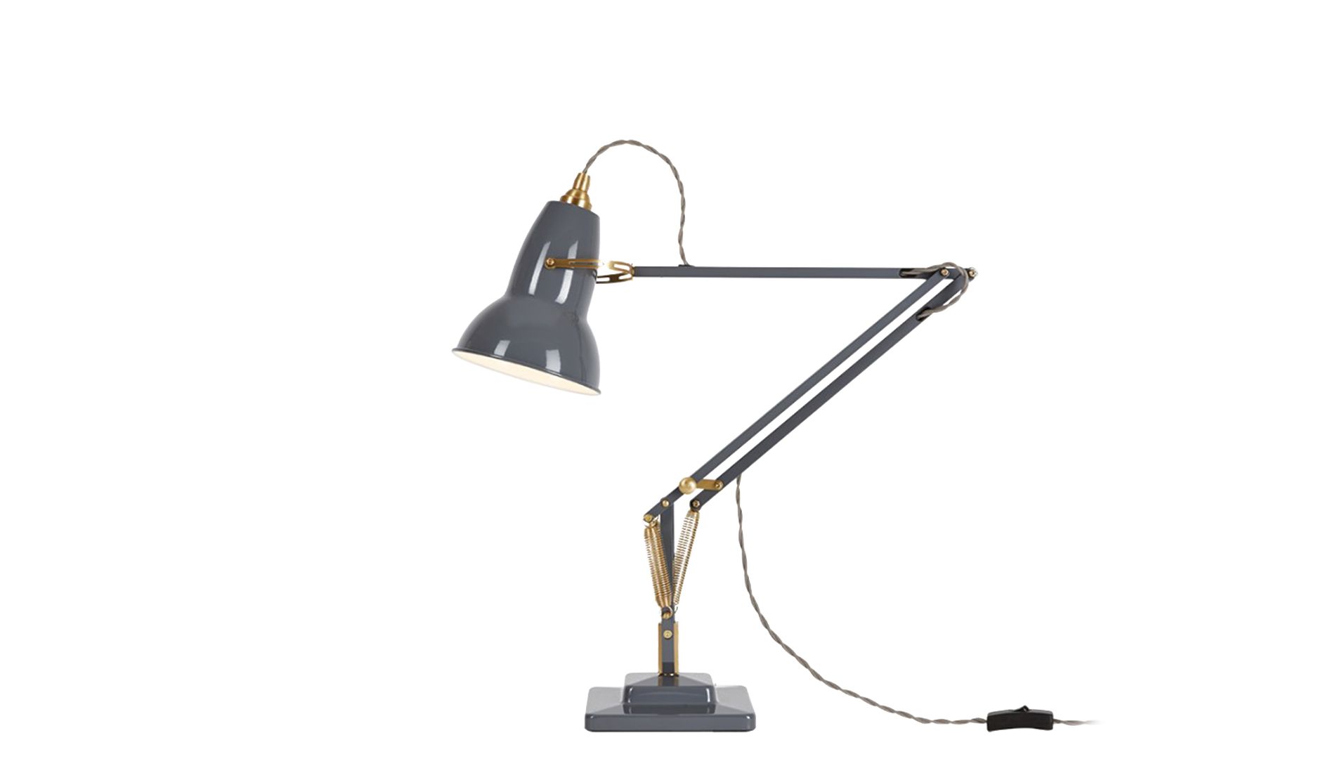 Lampa v šedé barvě. Originál 1227 byl znovu vydán tradičním výrobcem Anglepoise v mosazném provedení. Zatímco tkané kabely a mosazné detaily vytvářejí nový estetický vzhled, ikonický design originálu 1227 zůstává nezměněn. Díky kloubům a pružinám může být lampa umístěna téměř v jakékoli poloze a zůstává v ní bez zvláštního uzamčení.