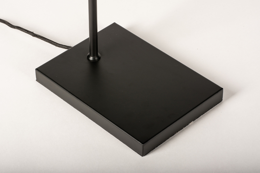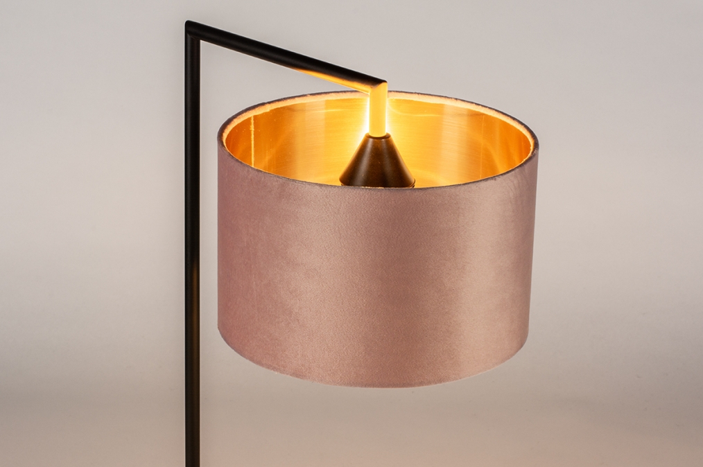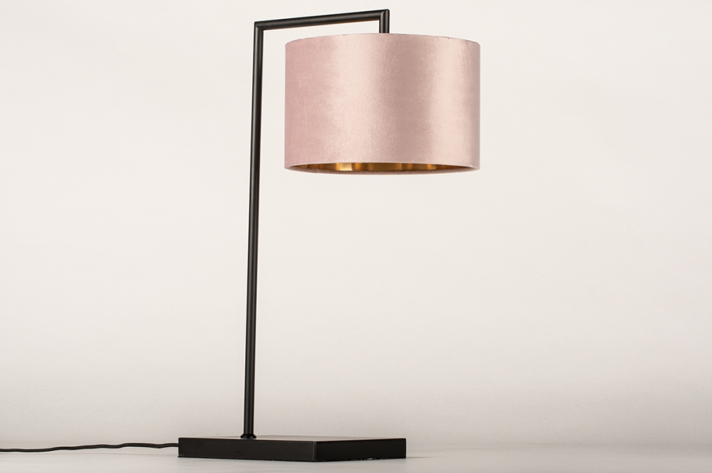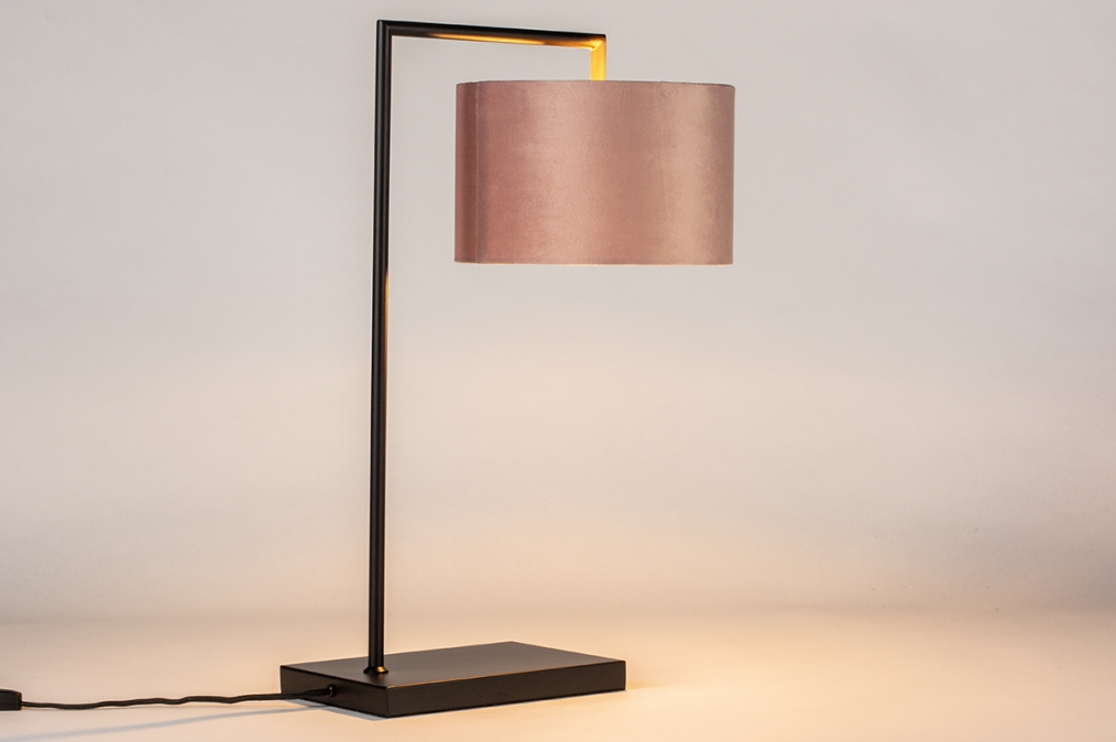 Stolní lampa v moderním designu vyrobená z kovu v černé barvě s růžovým textilním stínítkem. Tato stolní lampa má elegantní design a luxusní stínidlo. Stolní lampa se naklání mírně dopředu, což dává hranatému tvaru této lampy ještě výraznější styl. Hranatý tvar se odráží i v obdélníkové základně.