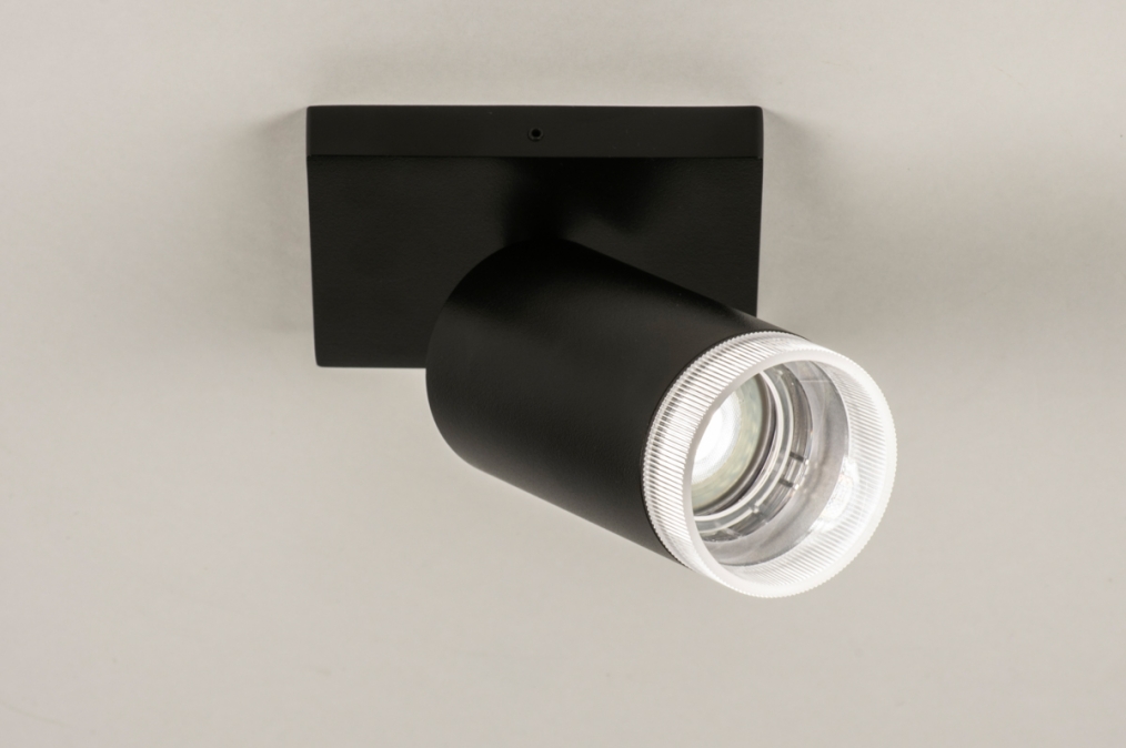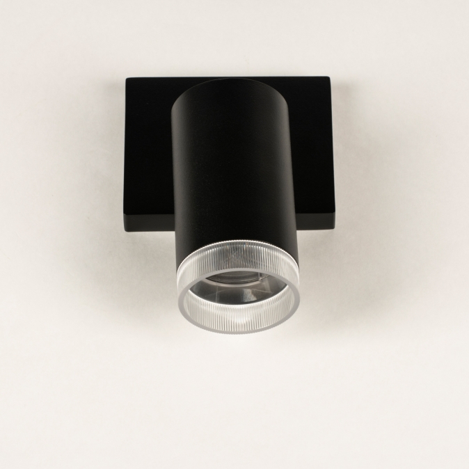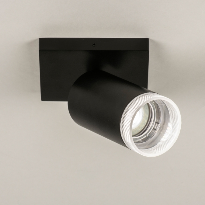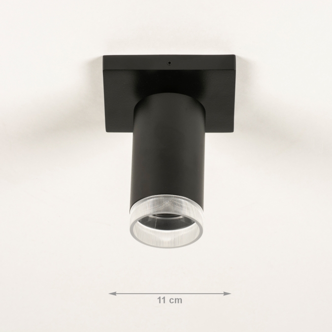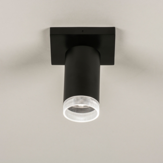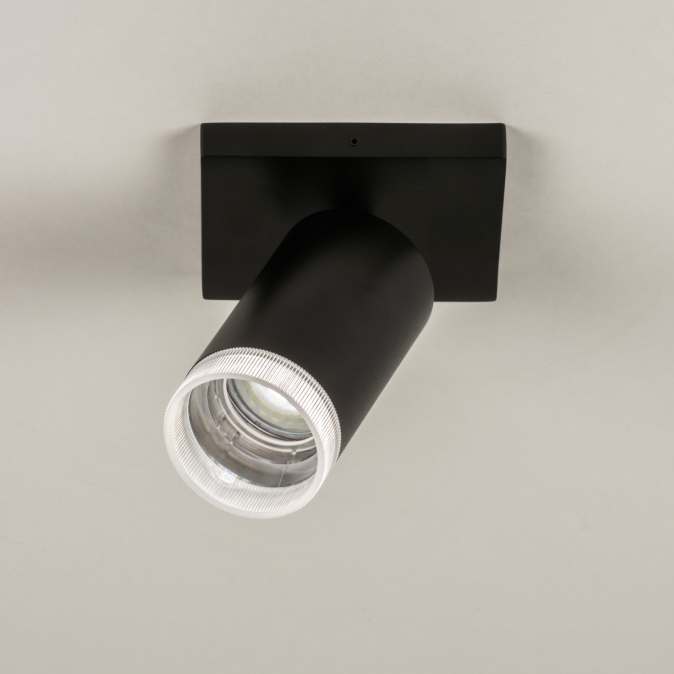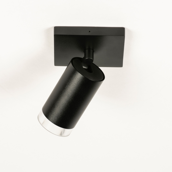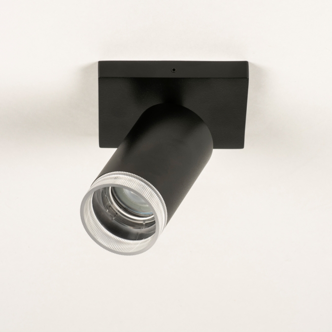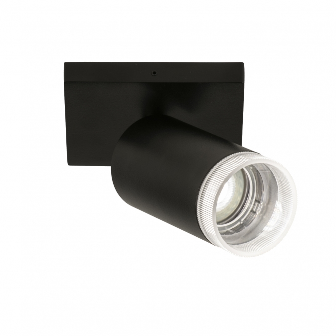 Stropní nebo nástěnné bodové svítidlo vyrobeno z kovu a hliníku v matně černé barvě, doplněné kroužkem z plexiskla.