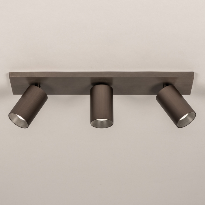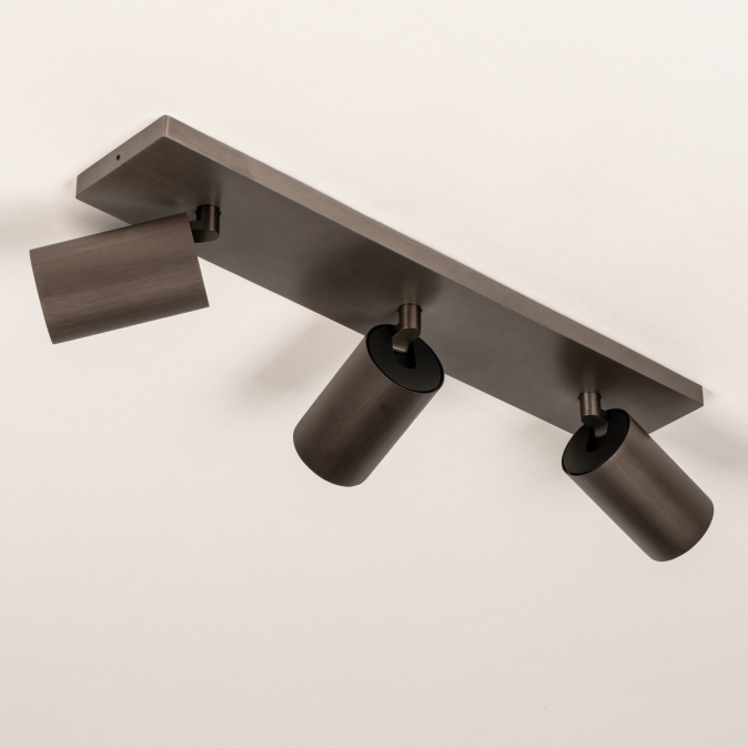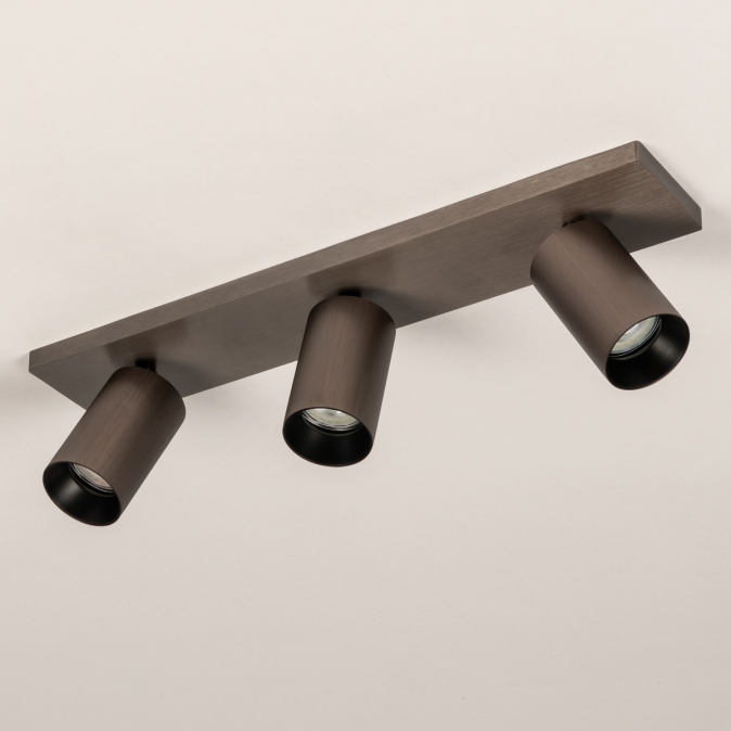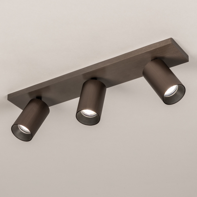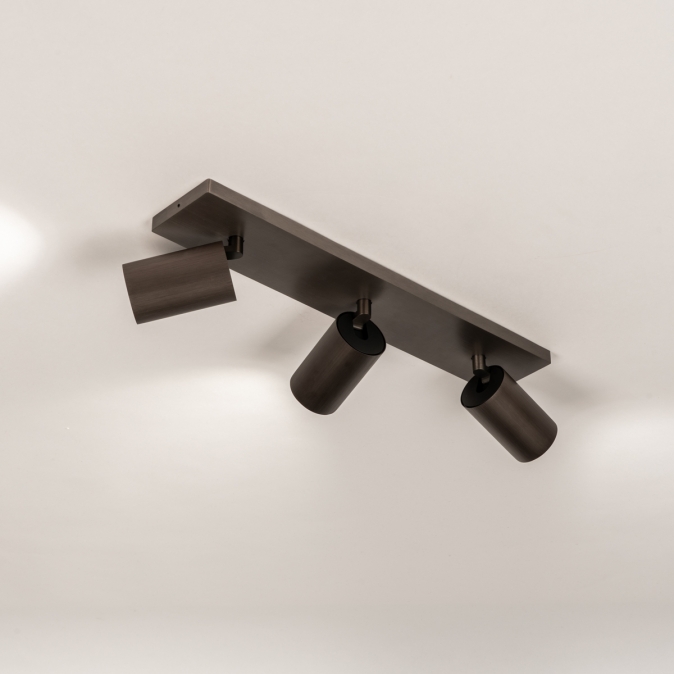 Stropní bodové kvalitní svítidlo v moderním designu se třemi nastavitelnými bodovkami. Svítidlo je vyrobeno z hliníku v hnědé barvě.
