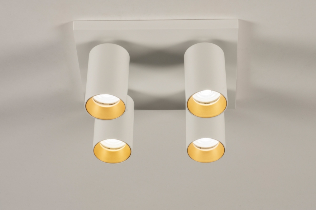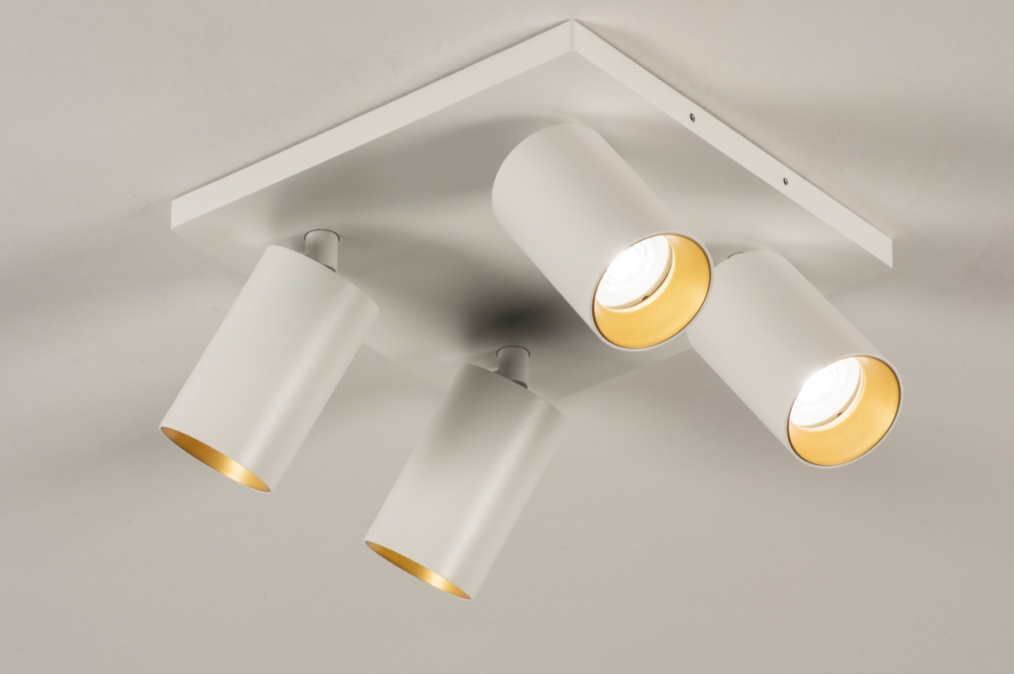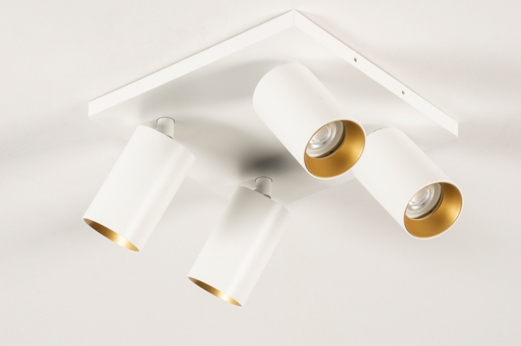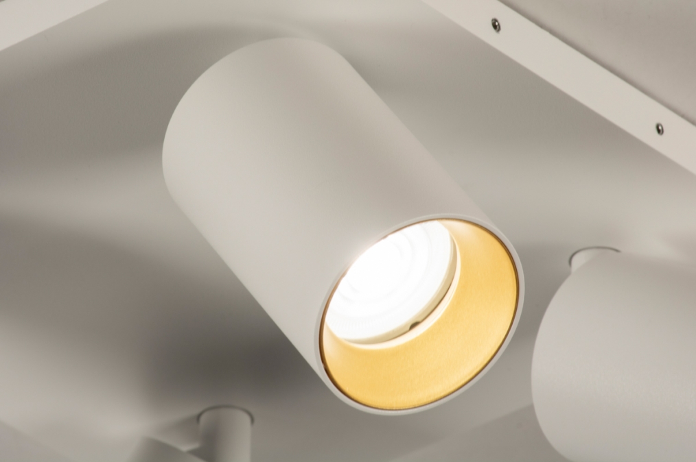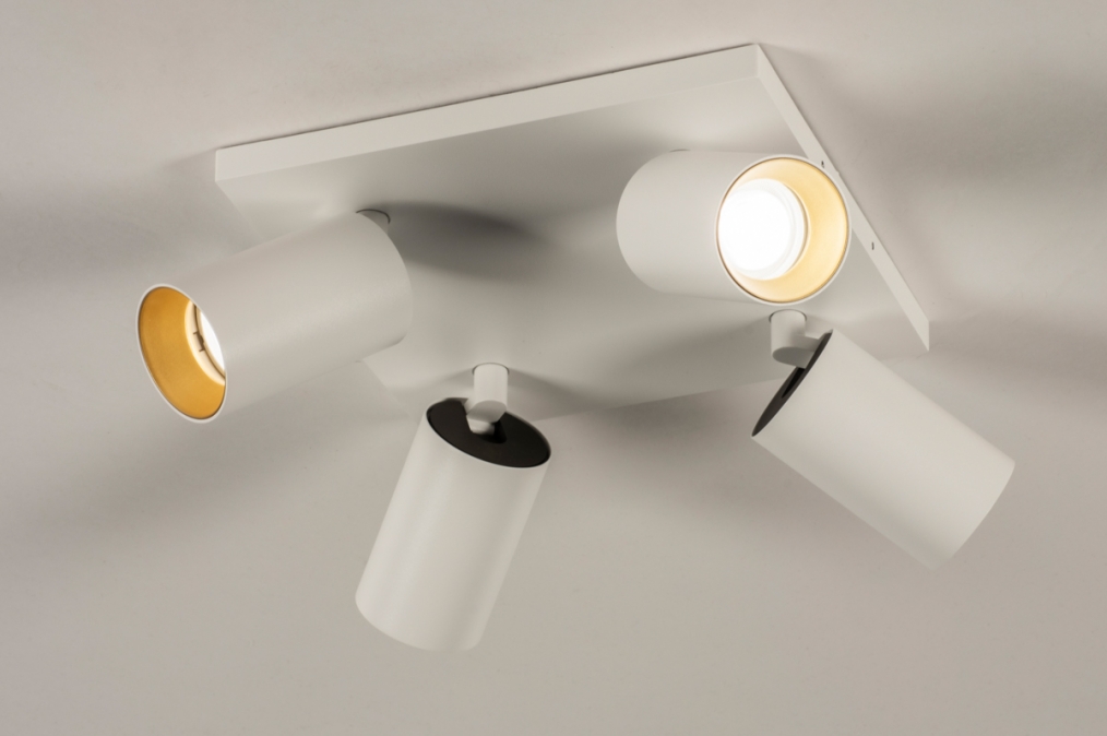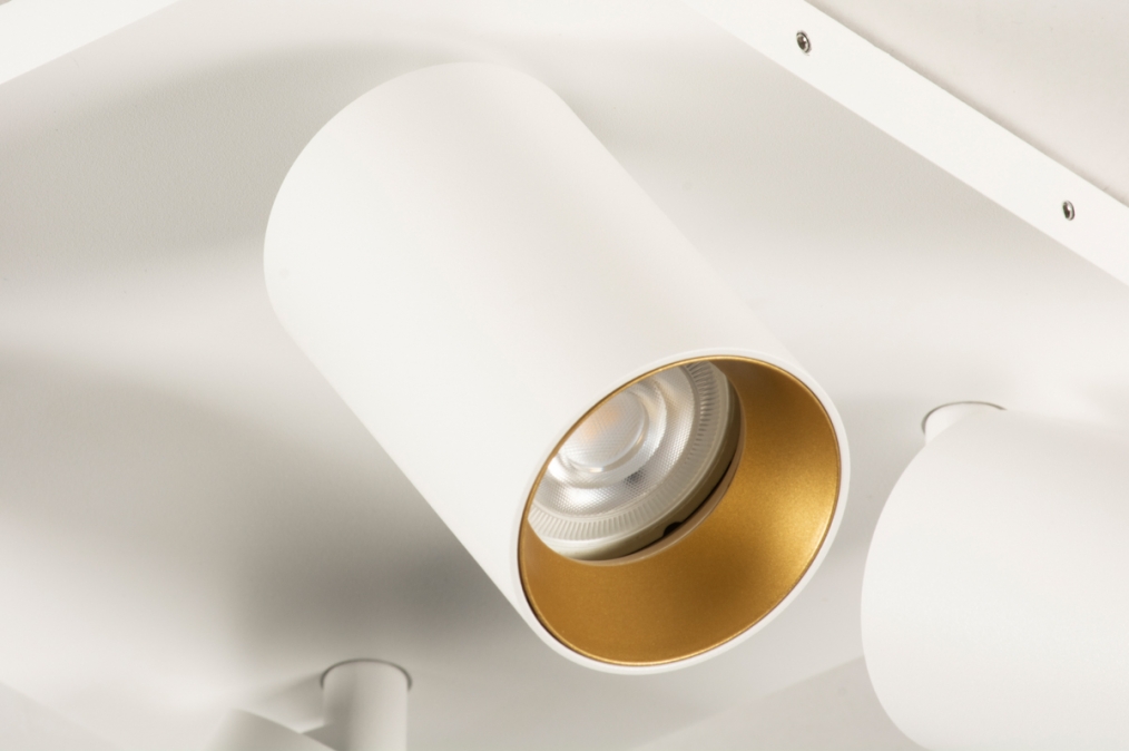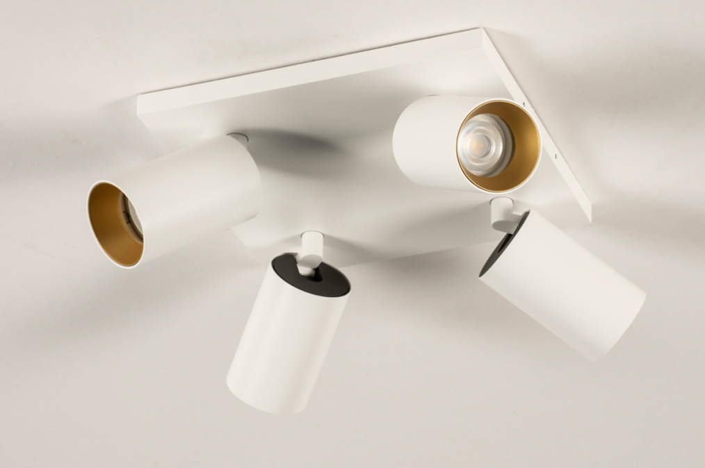 Stropní bodové svítidlo v moderním designu se čtyřmi nastavitelnými bodovkami. Svítidlo je vyrobeno z hliníku v matně bílé barvě v kombinaci se zlatou barvou.