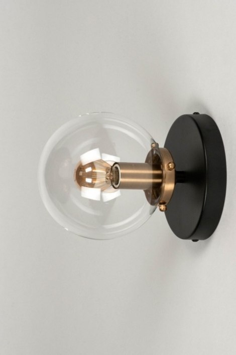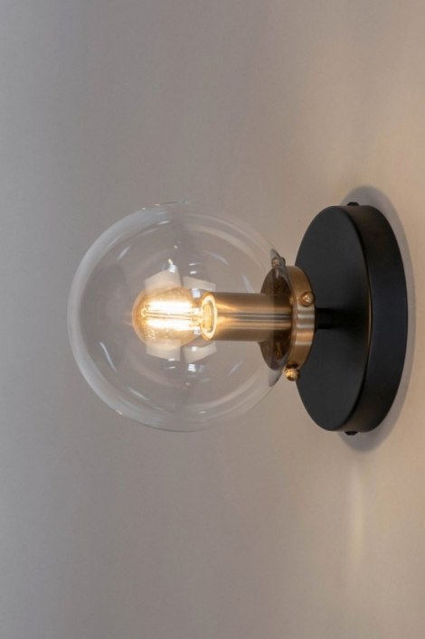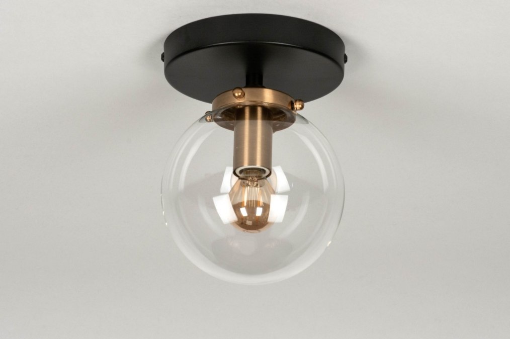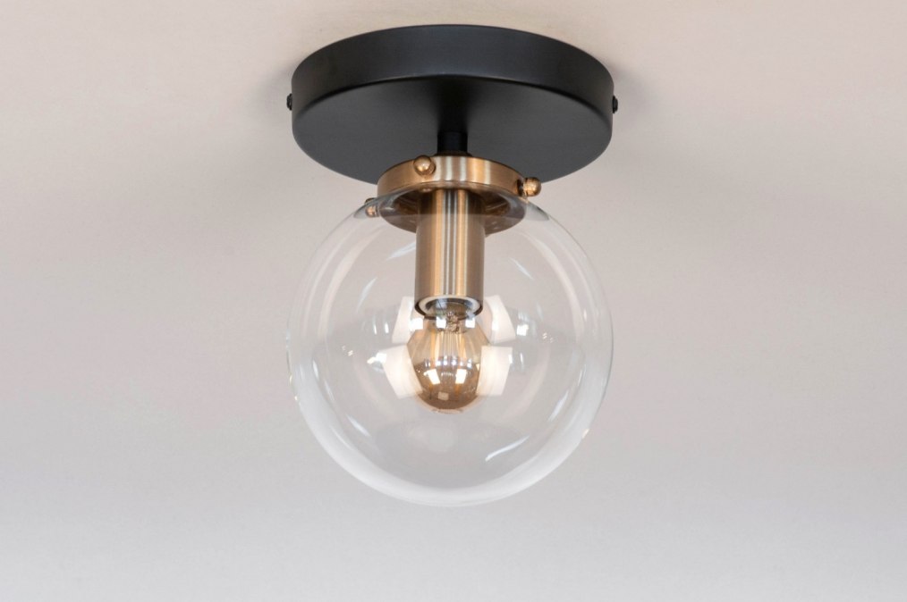 Moderní designové stropní svítidlo ve tvaru skleněné koule vyrobené z kombinace černě lakovaného kovu, mosazně zbarvené armatury a čirého skla. Záruka 10 let. Doprava zdarma.