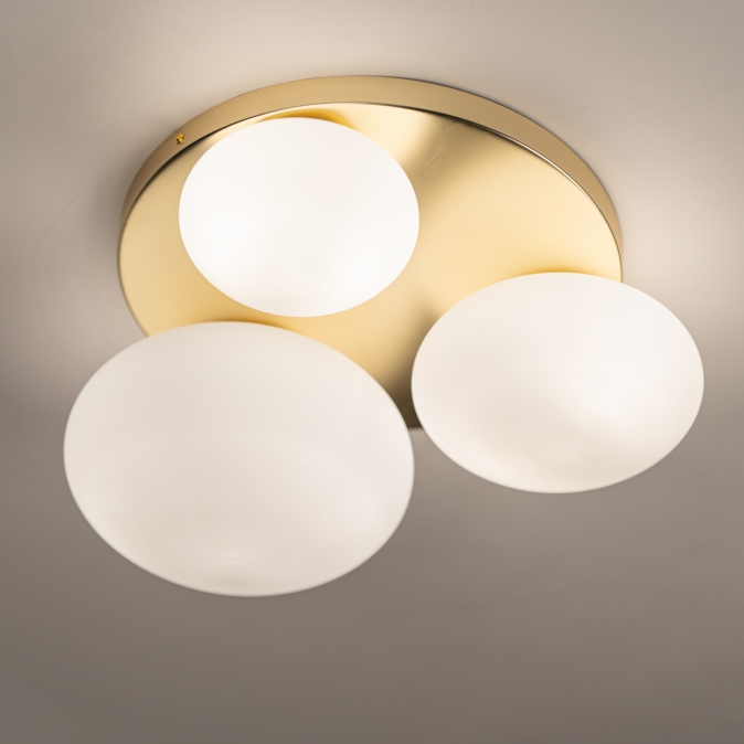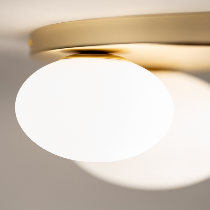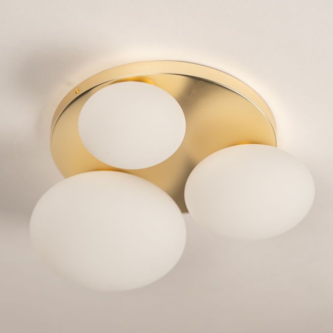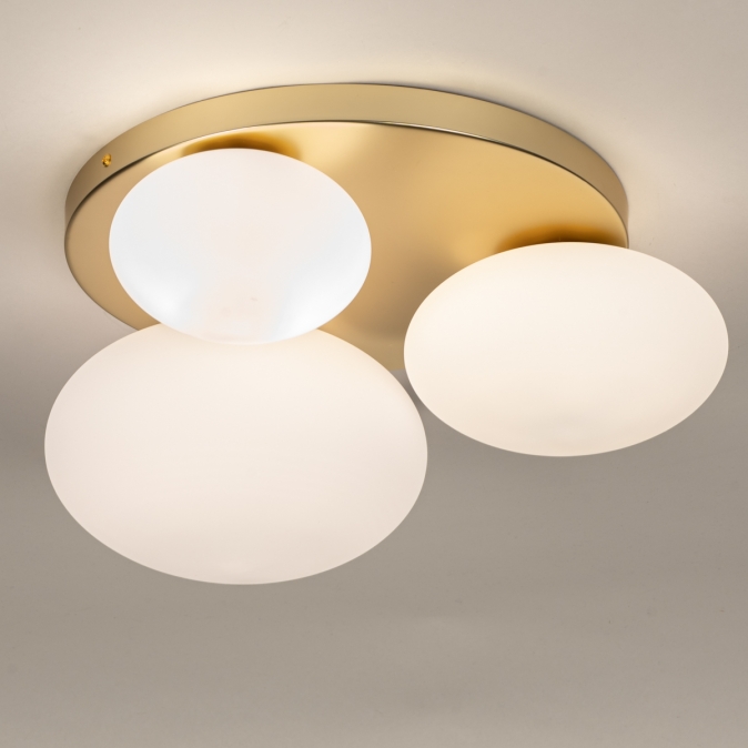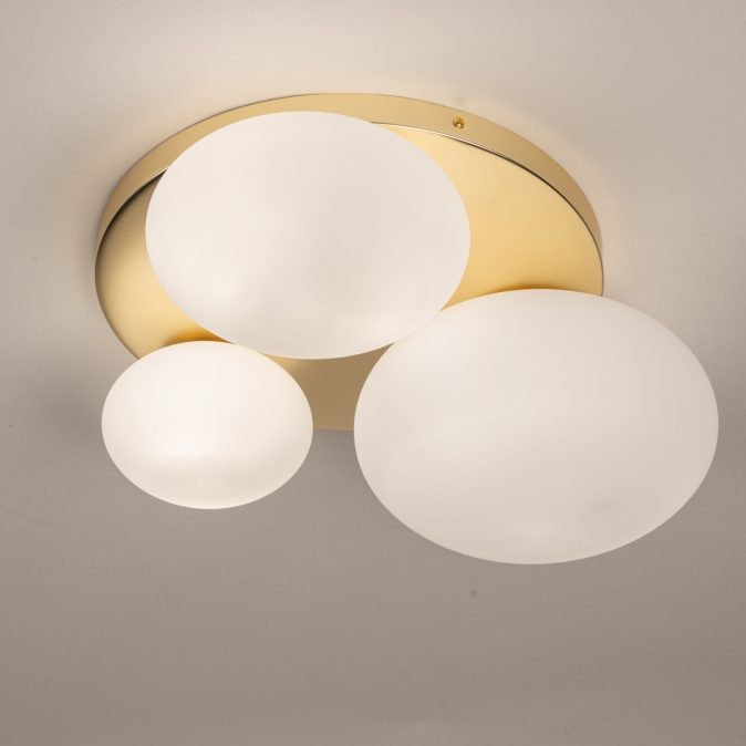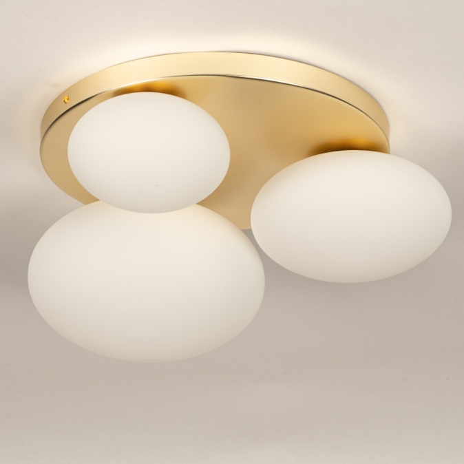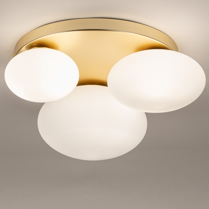 Zlatá barva a opálové sklo, to je kombinace, ze které vyzařuje luxus. Toto stropní svítidlo je díky třem hravě rozmístěným oválným skleněným koulím různých velikostí skutečným poutačem v místnosti. To, co dělá toto svítidlo výjimečným, je nádherná stropní deska ve zlatém provedení, která koule podpírá a krásně odráží světlo. Výsledkem je teplý a atraktivní vzhled, ideální pro stylový interiér. Perfektní do chodby, ložnice, kuchyně nebo jako výrazný prvek v obývacím pokoji.