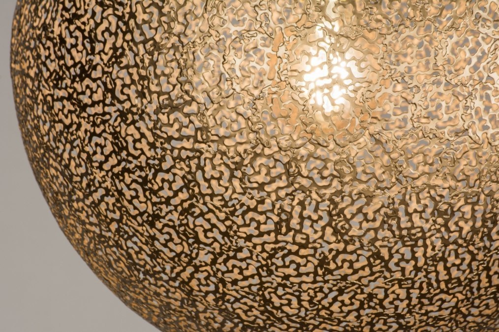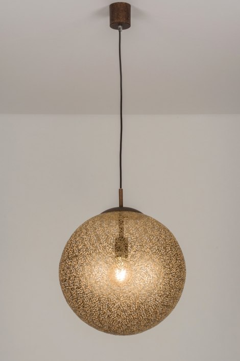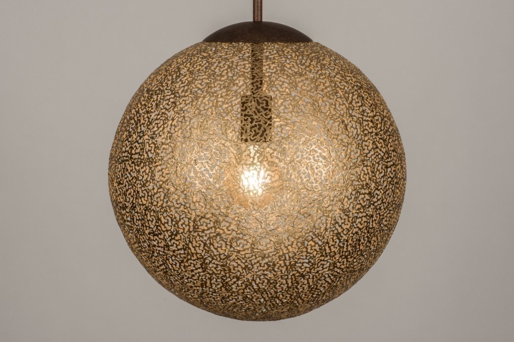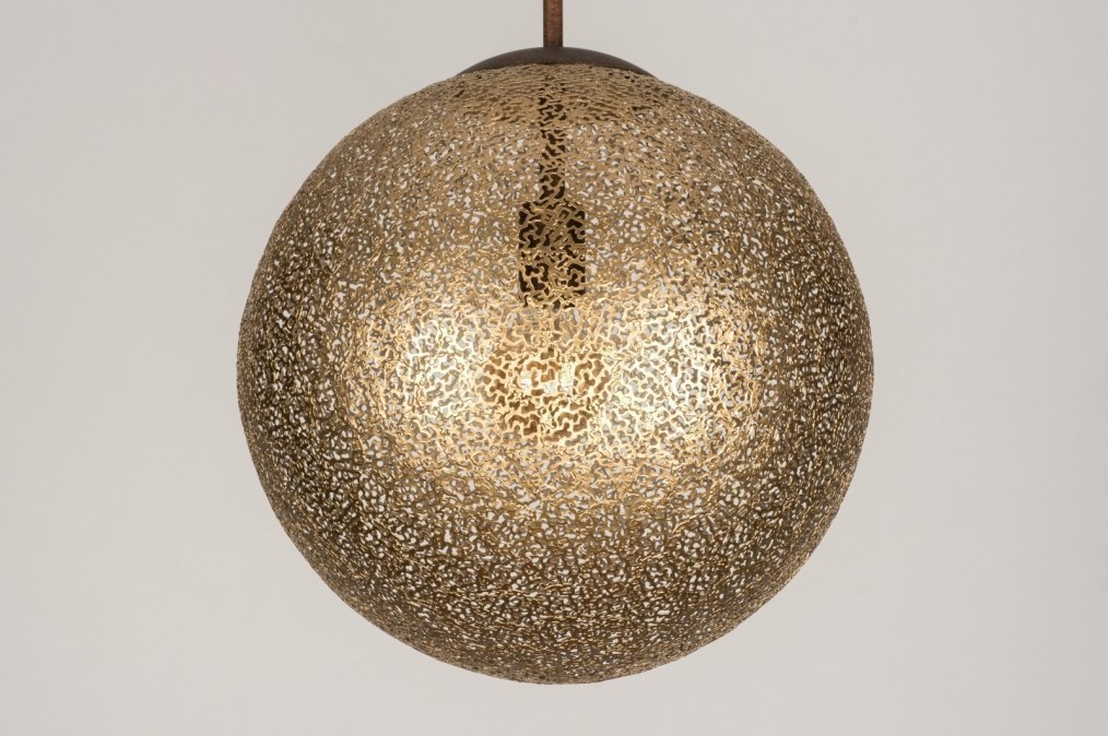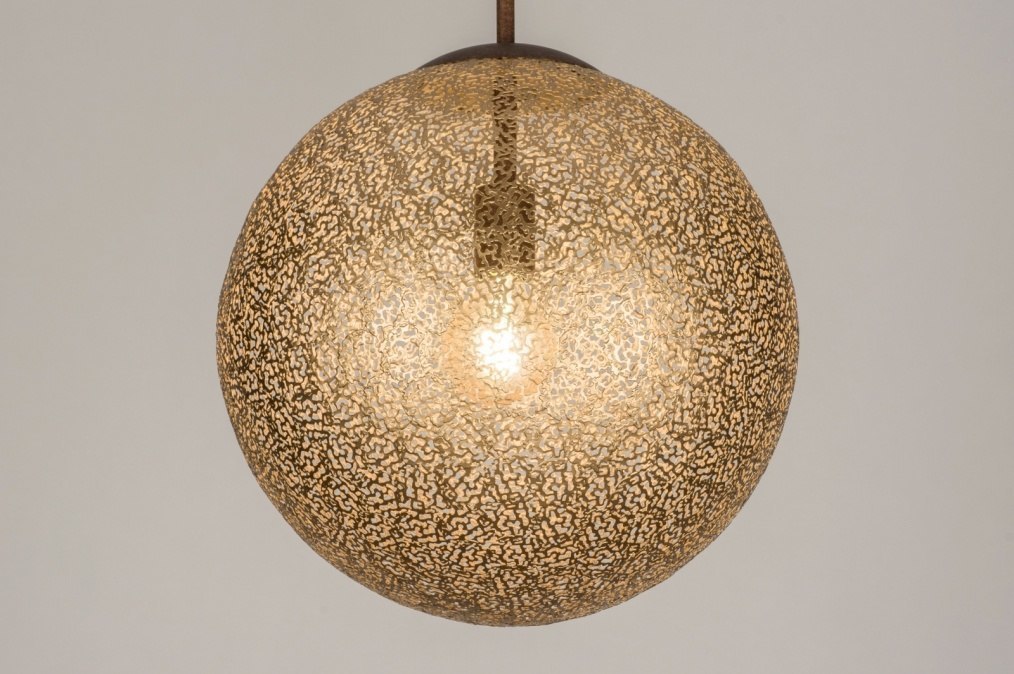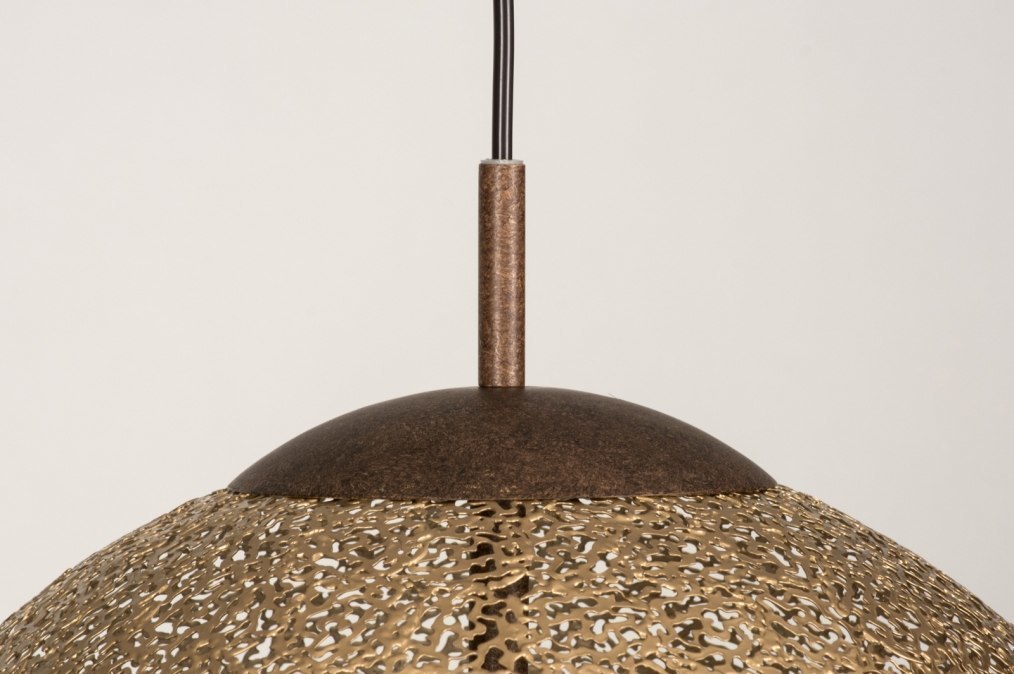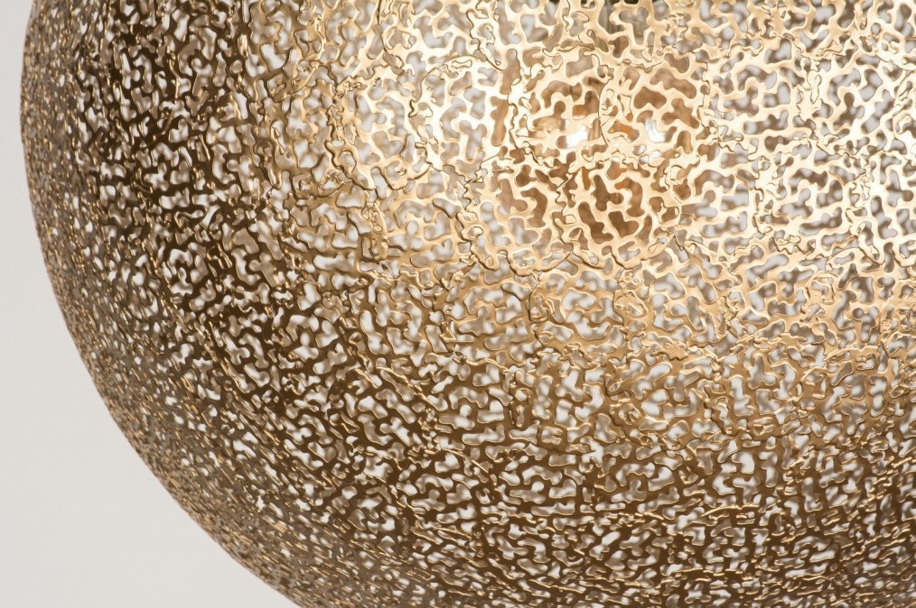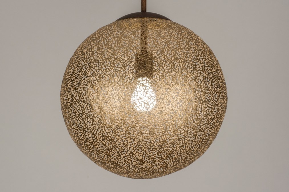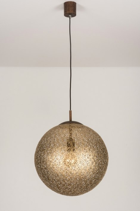 Toto svítidlo dodá Vašemu domovu teplo a atmosféru. Závěsné svítidlo se skládá z krásné koule zlaté barvy. Detaily, jako stropní deska a kování, jsou z antického bronzu. Kombinace antického bronzu a matného zlata dodává svítidlu velmi stylový vzhled. Koule má otevřenou strukturu, která vytváří krásný odraz světla, jakmile se svítidlo rozsvítí.