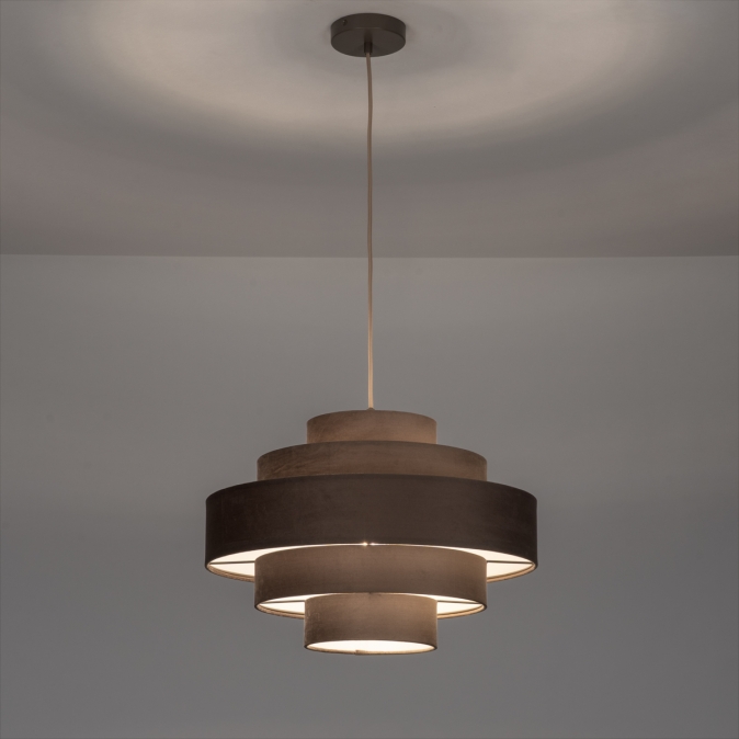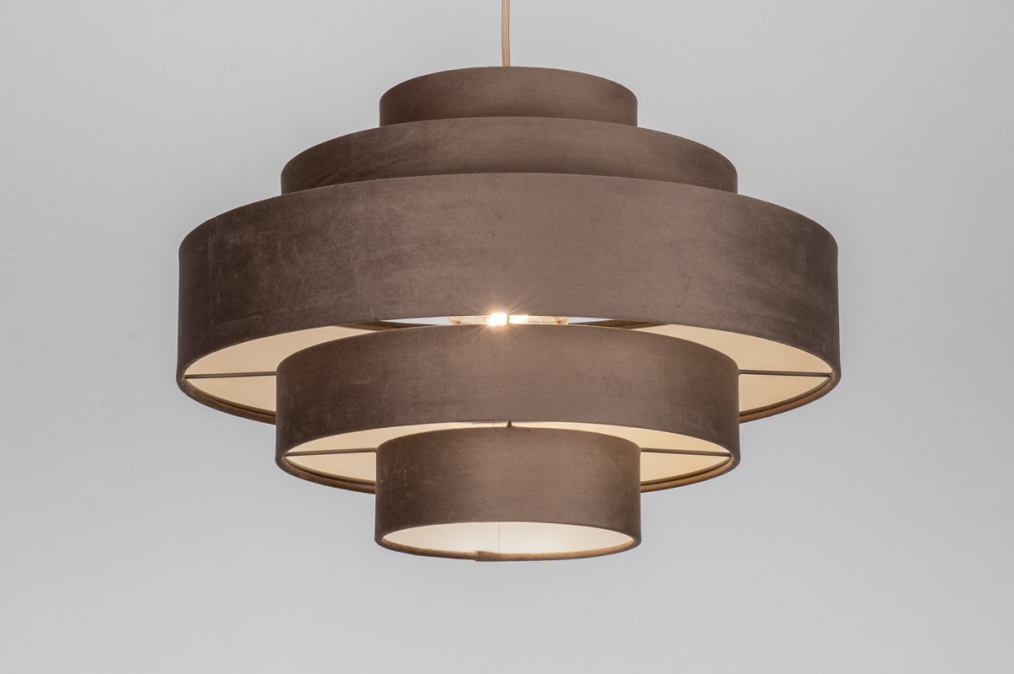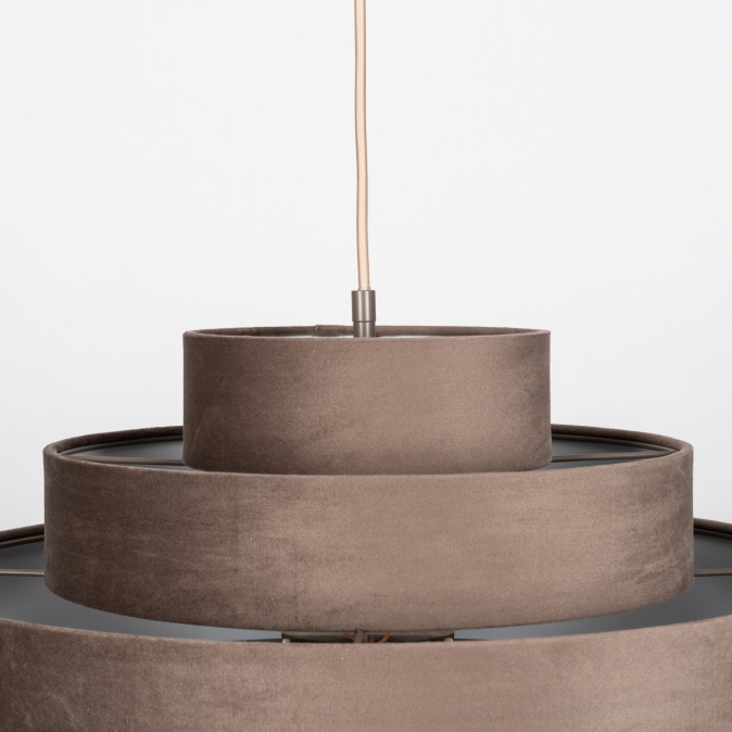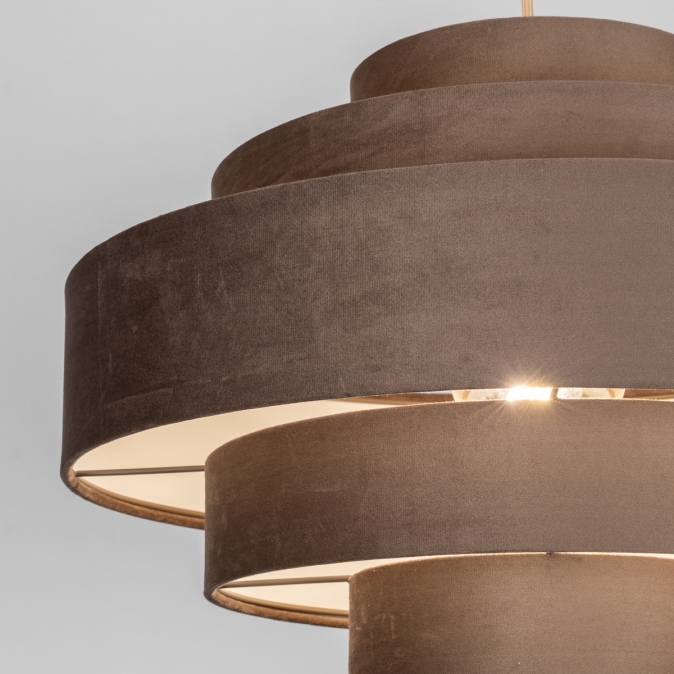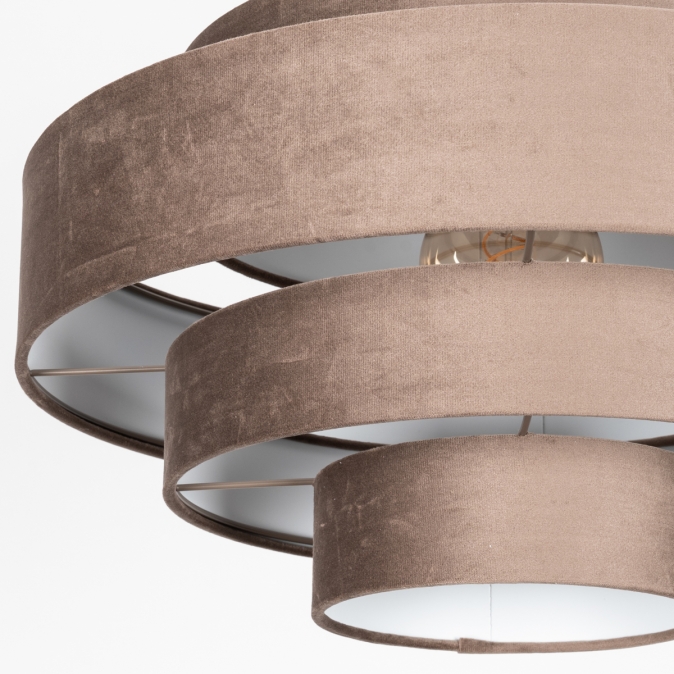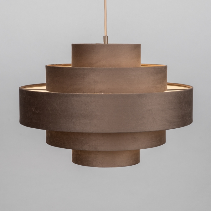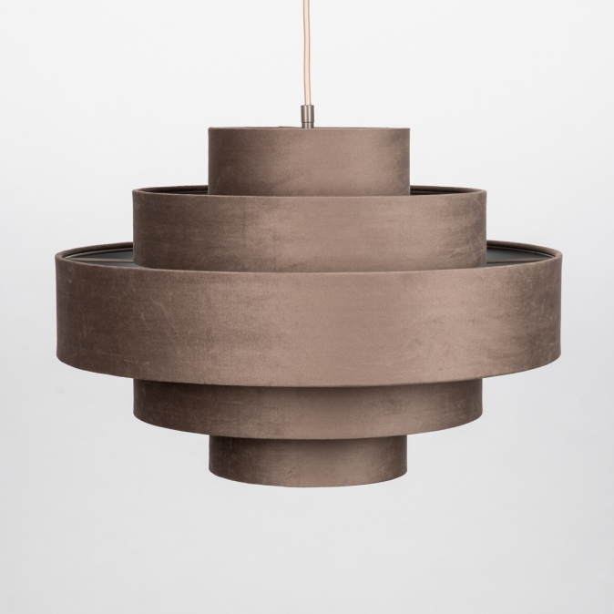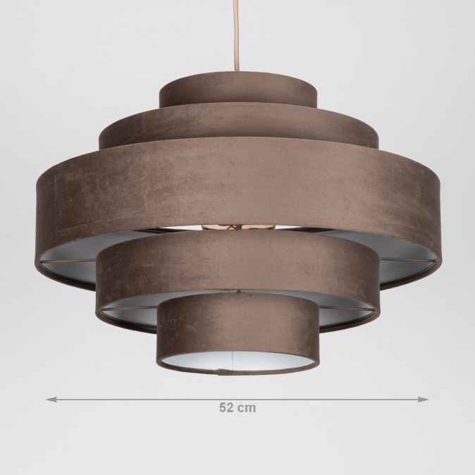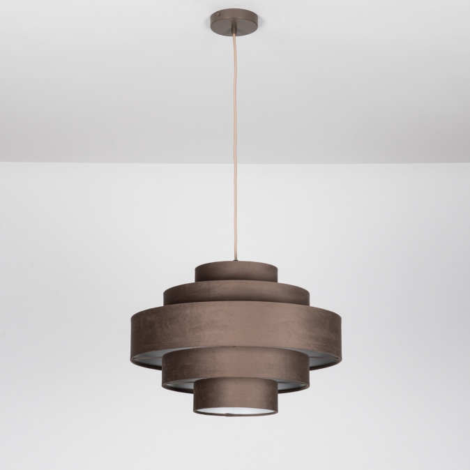 Závěsné designové svítidlo z hnědé saténové látky. Měkké světlo a krásná, klidná atmosféra. Toto subtilní závěsné svítidlo to naprosto zajišťuje. Hnědé závěsné svítidlo se skládá z pěti kroužků z krásné hnědé saténové látky. Kroužky v různých velikostech dodávají svítidlu krásný hloubkový efekt. Díky krásnému tvaru, neutrální látce a kompaktní velikosti je toto svítidlo vhodné do různých stylů bydlení a místností. Pokud uvažujete například o skandinávském stylu bydlení, pak si toto závěsné svítidlo přijde na své.
