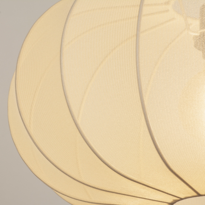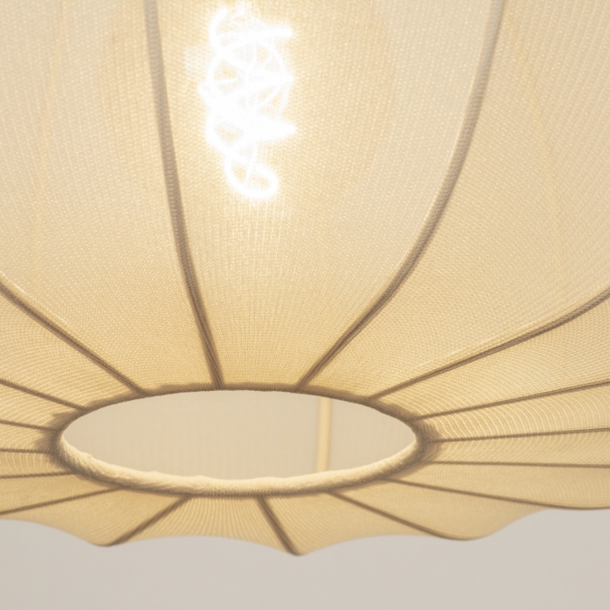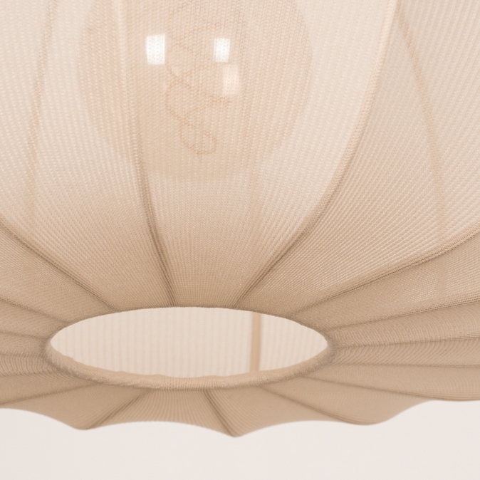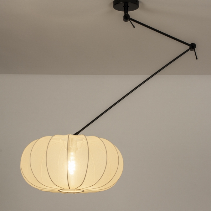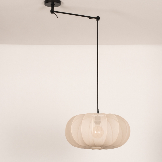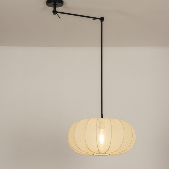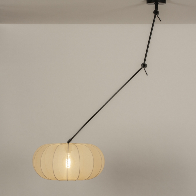 Toto nastavitelné stropní svítidlo/závěsné svítidlo v béžové barvě se skládá z několika částí. Délka krátké paže je 30 cm. Délka dlouhé paže je 70 cm. Béžové stínidlo poskytuje jemné a měkké světlo. Stínidlo je vyrobeno z krásné béžové látky, která je průhledná a má pruhovanou strukturu.