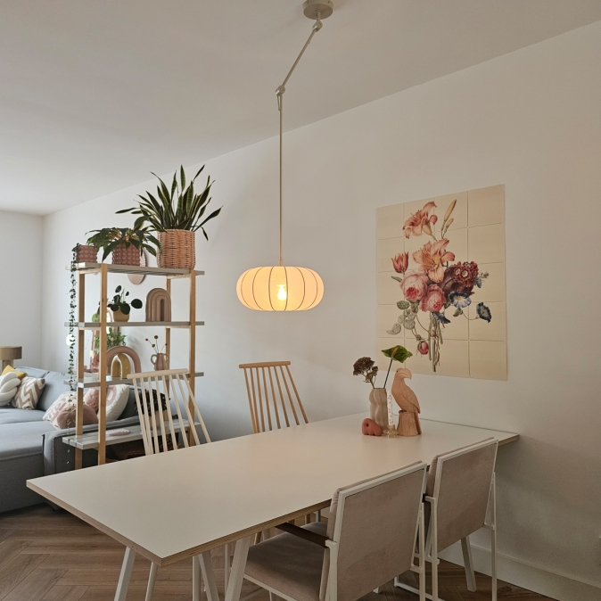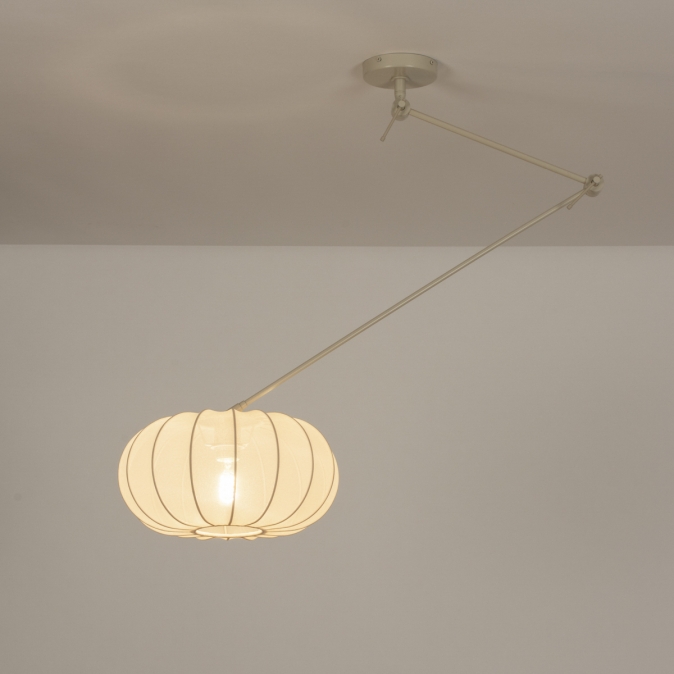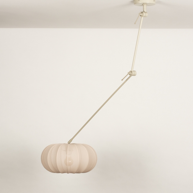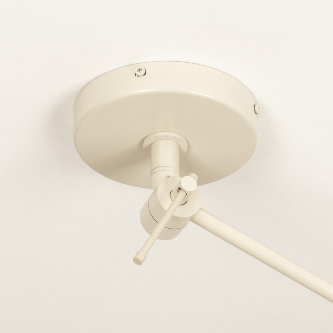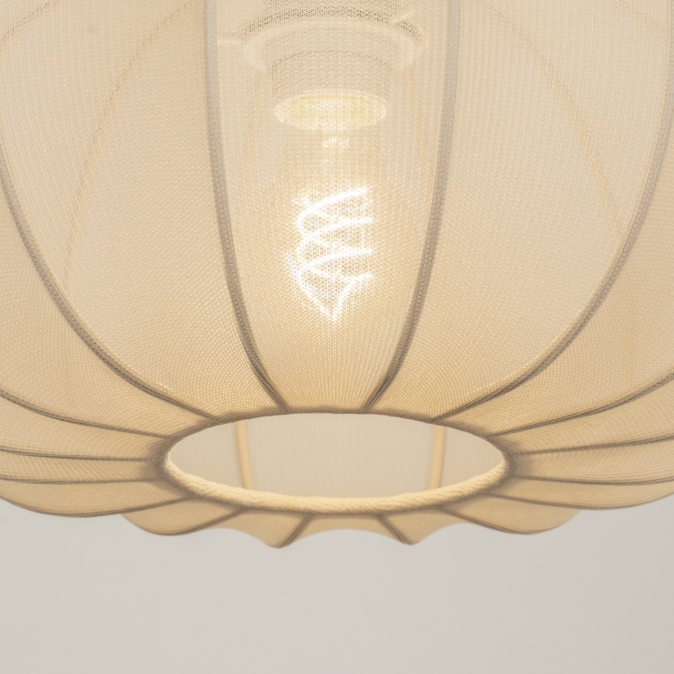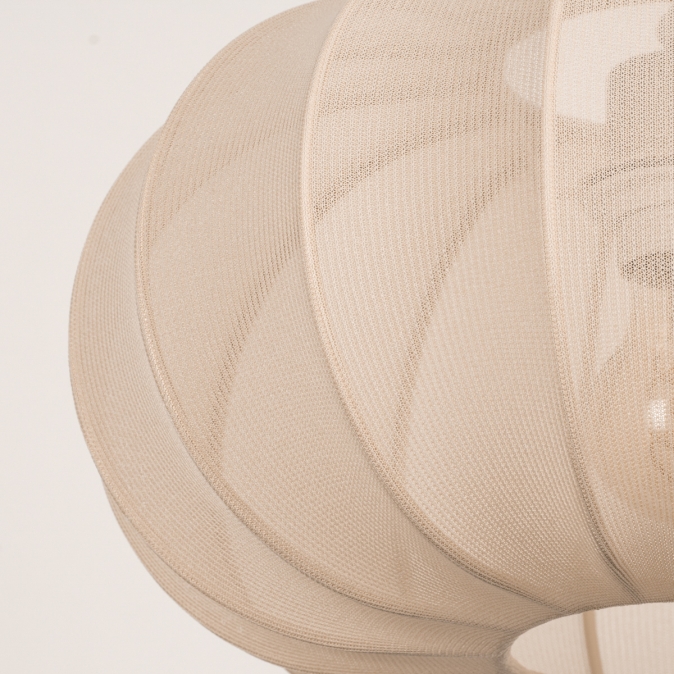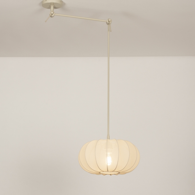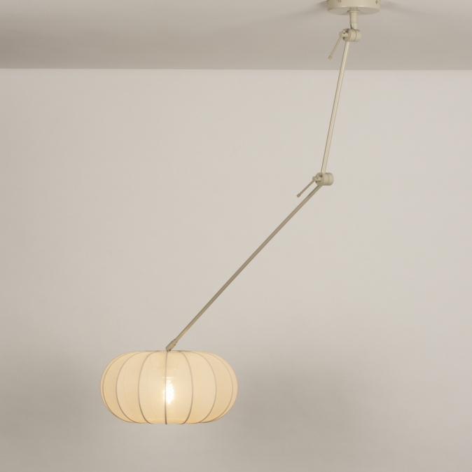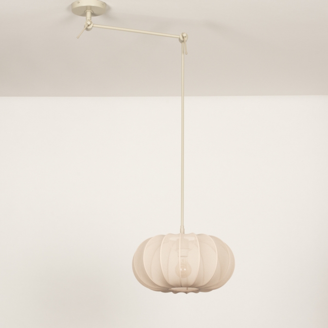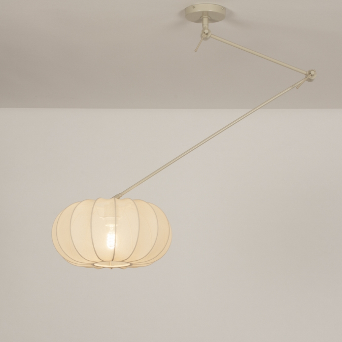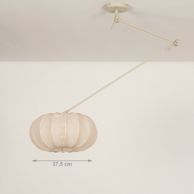 Toto nastavitelné stropní svítidlo/závěsné svítidlo v béžové barvě se skládá z několika částí. Délka krátké paže je 30 cm. Délka dlouhé paže je 70 cm. Béžové stínidlo poskytuje jemné a měkké světlo. Stínidlo je vyrobeno z krásné béžové látky, která je průhledná a má pruhovanou strukturu.